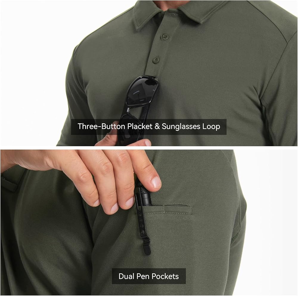 Tactical Multi-Functional Design: Featuring a classic polo shirt style with a three-button placket, it also includes a tactical hanging loop under the buttons for securing sunglasses or a microphone, as well as dual pen pockets on the left sleeve for easy access to tactical pens or other tools