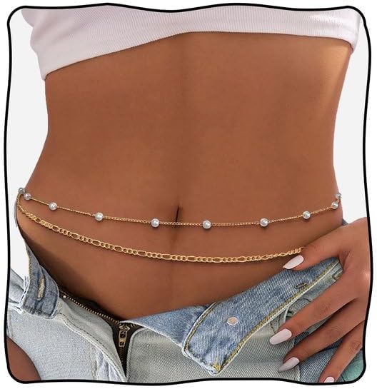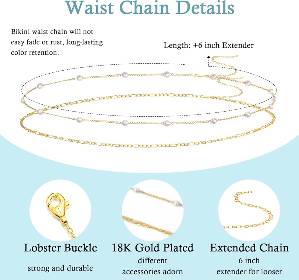 • مجوهرات سلسلة الجسم للنساء: سلسلة الخصر اللؤلؤ مصنوعة من النحاس عالي الجودة مع سطح مطلي بالذهب 18K. لن تتلاشى سلسلة الخصر البيكيني أو الصدأ ، والاحتفاظ بالألوان طويلة الأمد ، وقوية ودائمة.