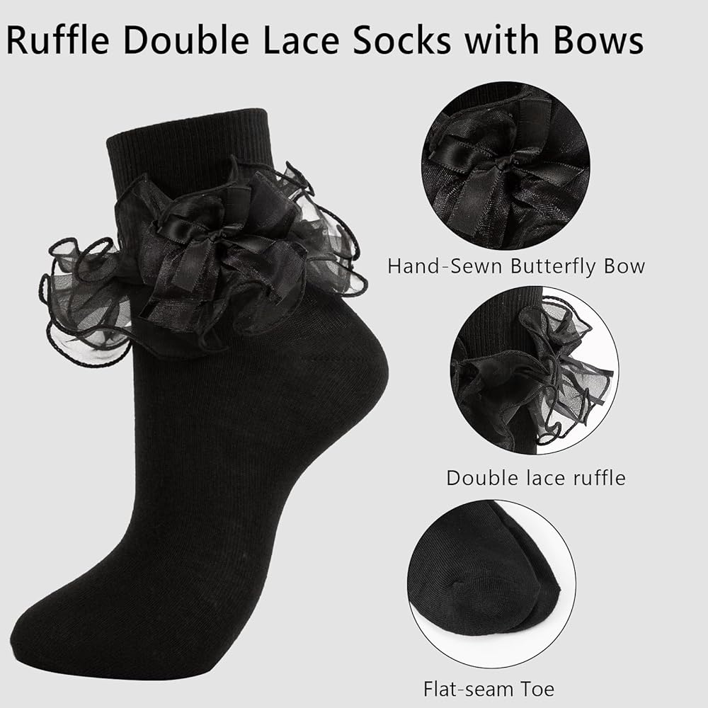 【Cute Ruffled Socks for Women】 These big ruffle socks woman are made of soft cotton fabrics,double-layer lace ruffles,lace with exquisite ribbon bows,cute and comfortable,bringing you a sexy and youthful feeling. The frilly socks women will add an adorable touch to your any outfits.