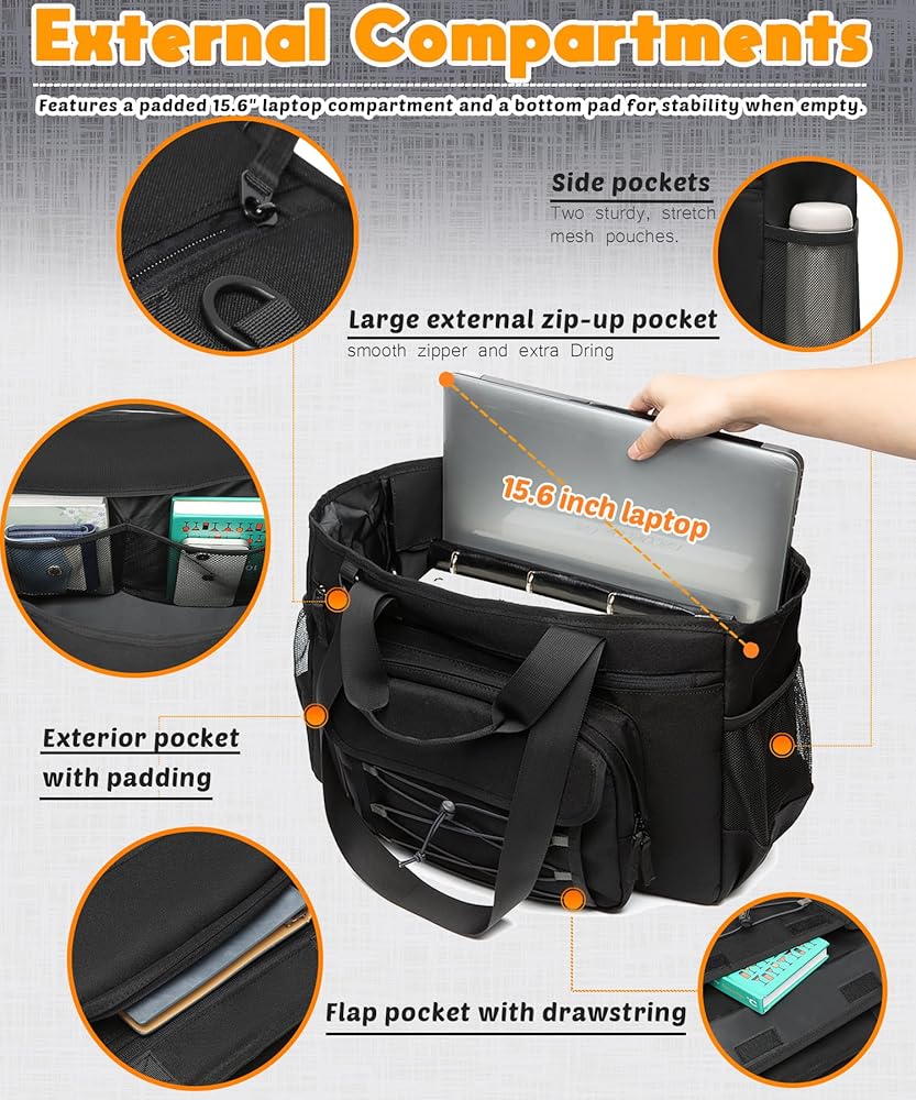 With dimensions of 16.9" (L) x 7.0" (W) x 12.6" (H), Short strap 6.5 inches, long strap 15 inches, only 1.3lb. this bag is designed to keep all your essentials neatly organized. It features a padded compartment that fits up to a 15.6" laptop and 13" tablet ensuring your device stays safe during travel or daily use. In addition, the bag offers 6 exterior pockets and 4 interior pockets, allowing for optimal organization of your belongings. A Velcro pocket and a hidden, padded zippered pocket add extra layers of security and convenience for your valuables.