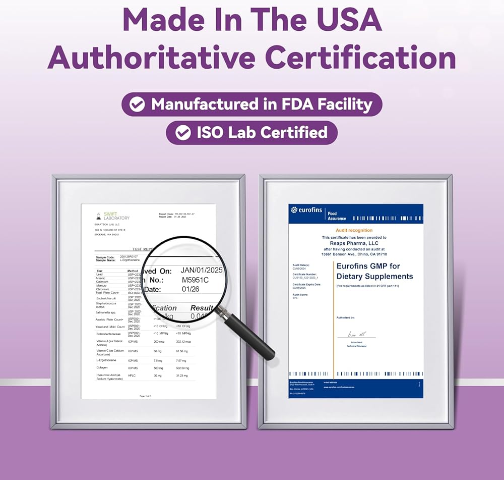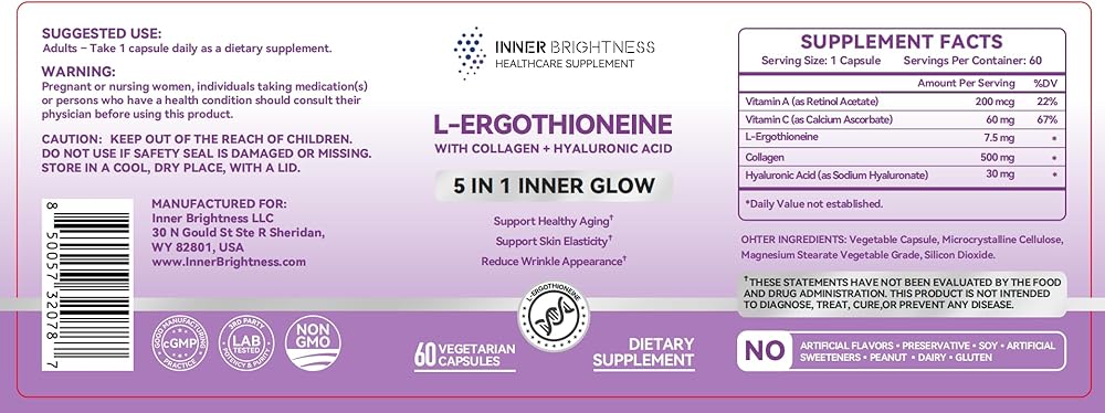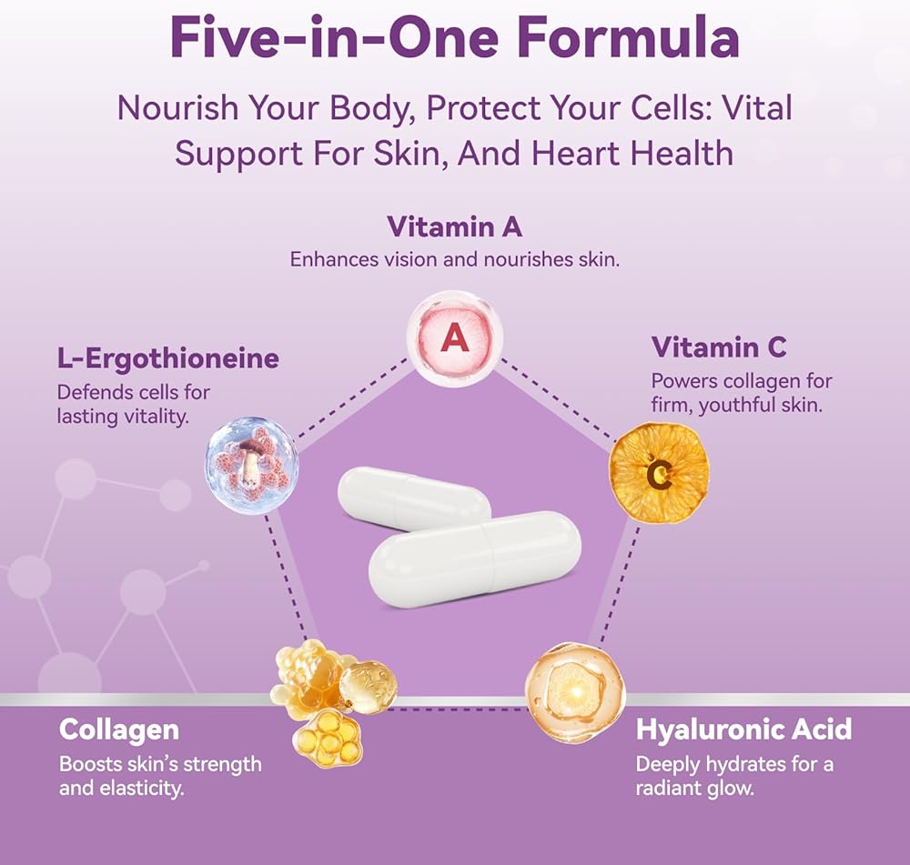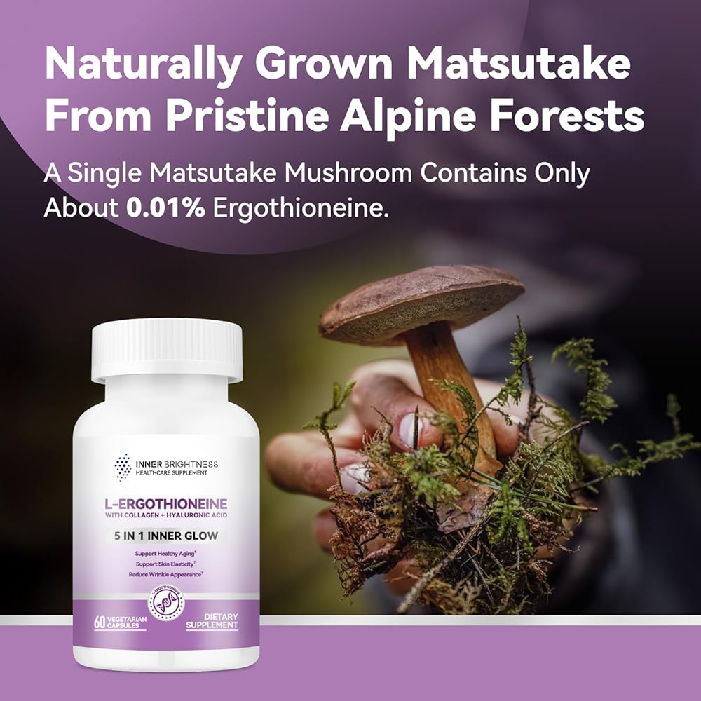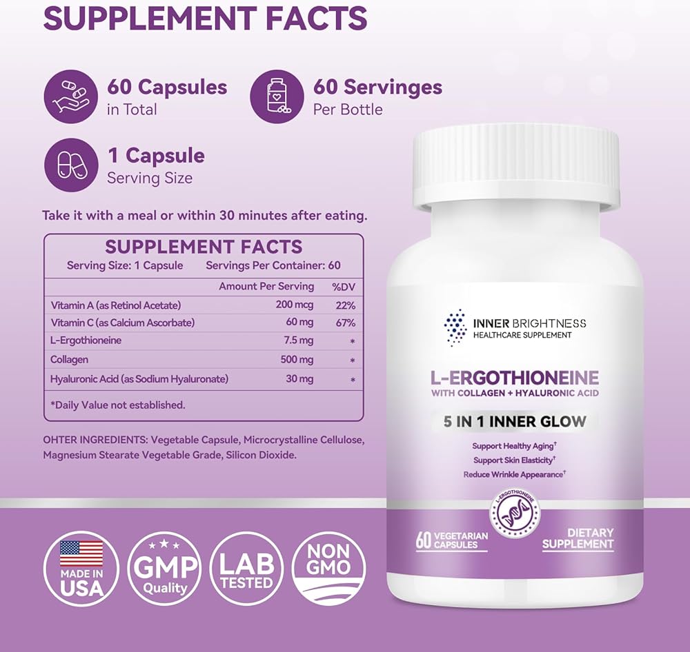 مكملات L-ergothioneine مع حمض الهيالورونيك والكولاجين للنساء ، غير المعدلة وراثيا ، خالية من الغلوتين ، نباتي ، يعزز طول العمر والشيخوخة الصحية ، 60 كبسولة