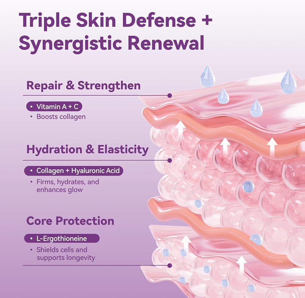 • الدفاع الثلاثي للجلد + التجديد التآزري: 7.5 ملغ من حماية L-ergothioneine يدافع عن الأضرار المؤكسدة في أعمق مستوى ، في حين أن 500 ملغ من الكولاجين و 30 ملغ من حمض الهيالورونيك يعيد بناء الجلد البشرة ، التي تكملها الفيتامينات A و C التي تقوم بتجديد سطح الجلد وتجديدها.