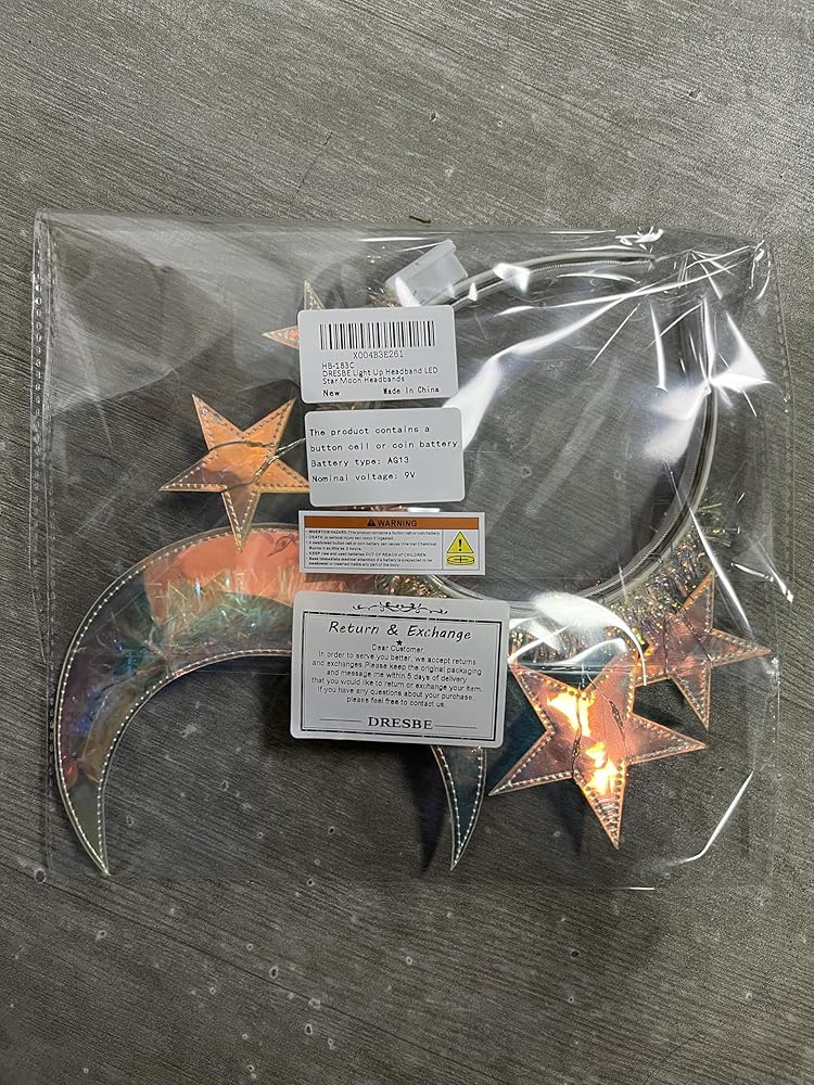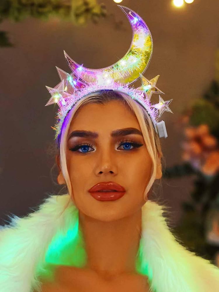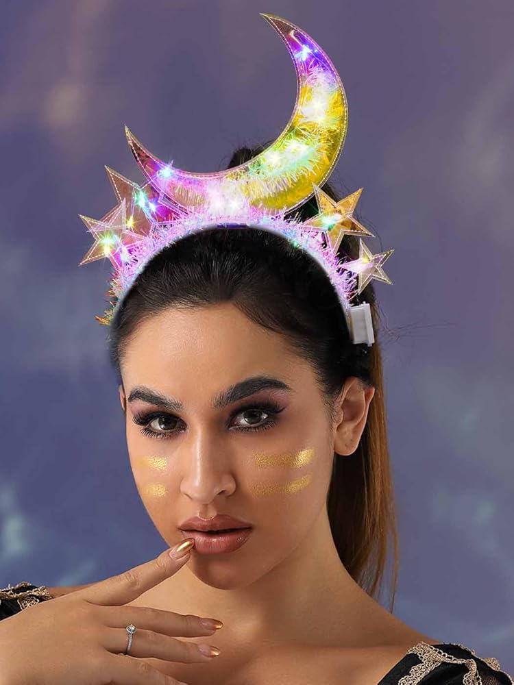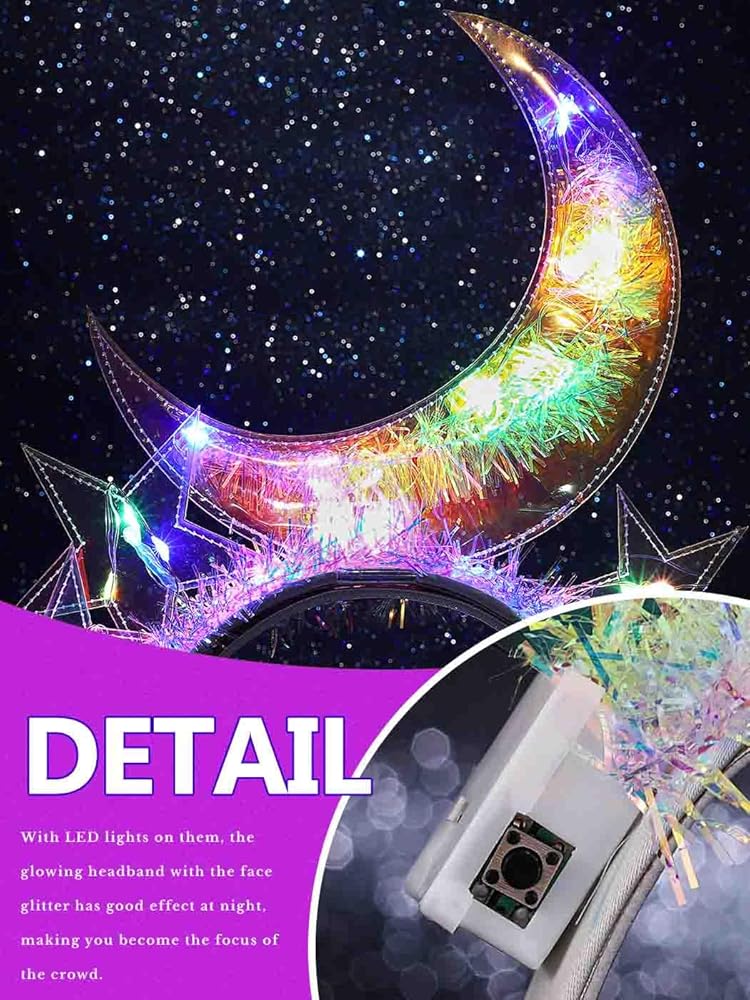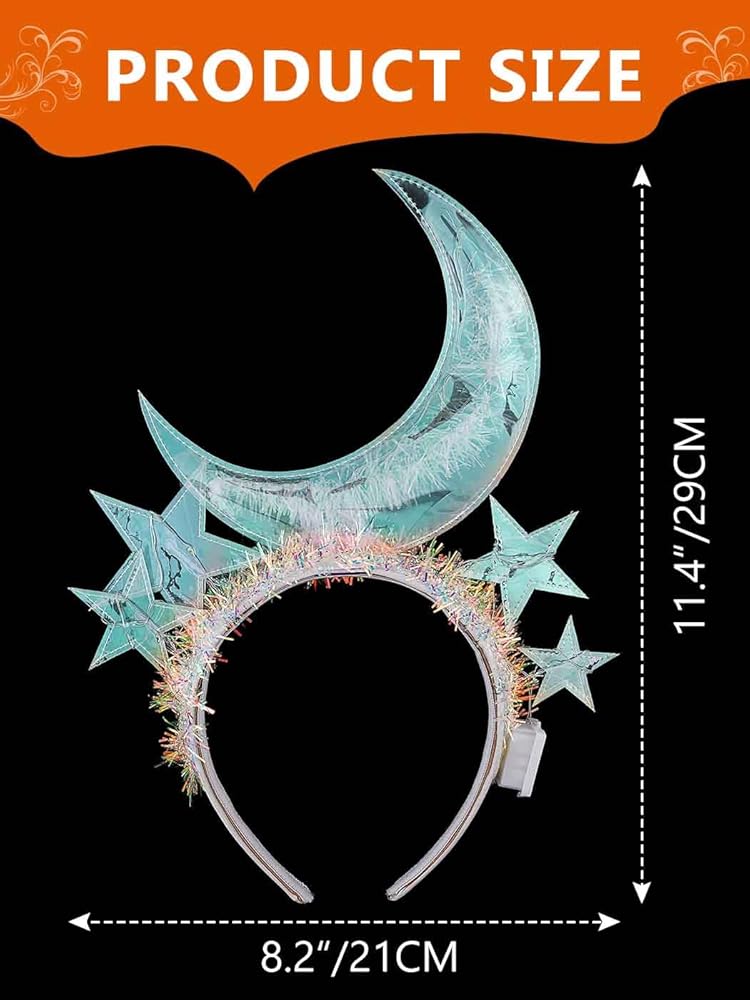 Light up headband with three twinkle modes, fast flash/slow flash/continuous on, you can easily switch mode by pressing the button on the side of the star hair hoop. Glowing headband is safe to use, it can keep flashing lasting for several hours while.