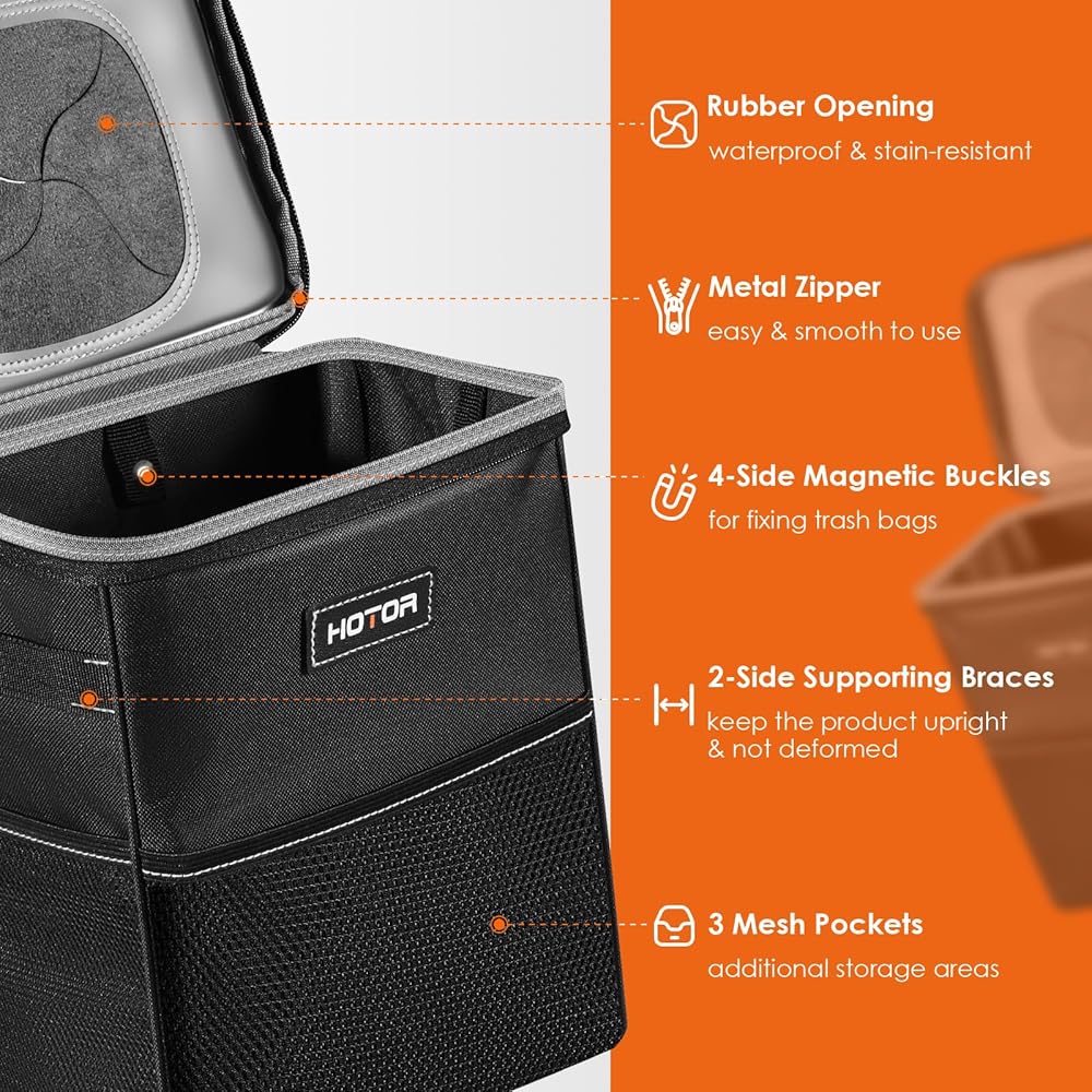 • بطانة مقاومة للماء: مع البطانة المدمجة المانعة للتسرب، سلة مهملات هوتور للسيارات تتكيف بكفاءة مع النفايات المختلفة بما في ذلك السوائل. علاوة على ذلك، فإن البطانة المقاومة للماء تجعل تنظيف سلة المهملات أكثر راحة. كل ما عليك فعله هو مسحها بقطعة قماش مبللة وتركها تجف في الهواء!