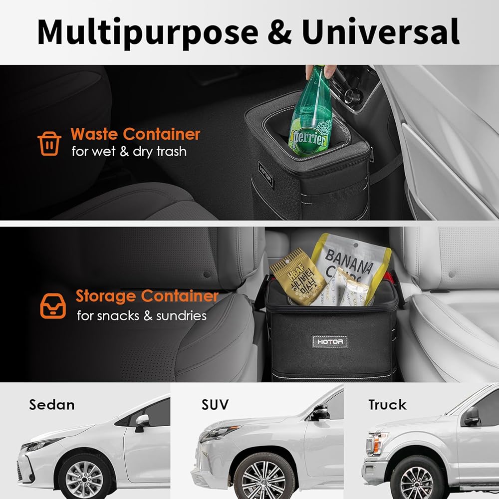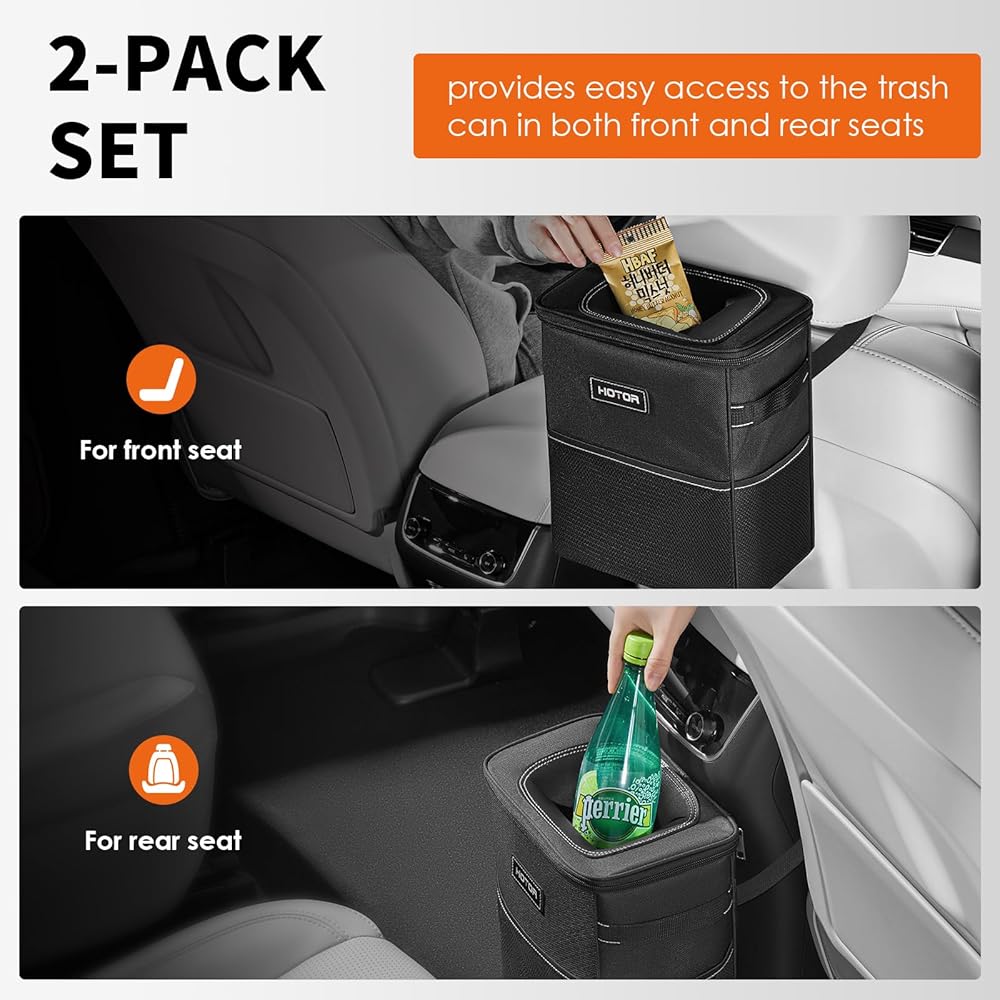 هوتور سلة مهملات للسيارة - عبوة من قطعتين، ملحقات السيارة المثالية للداخل، منظمات سيارة مانعة للتسرب وصندوق تخزين للمقاعد الامامية والخلفية، منظم سيارة مع اشرطة قابلة للتعديل، مشابك مغناطيسية، اسود