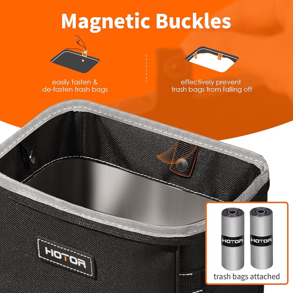 • مشابك مغناطيسية: يوجد 4 مشابك مغناطيسية معدنية داخل سلة مهملات السيارة هوتور مما يجعل استبدال أكياس القمامة في السيارة أمرًا سهلاً. ببساطة قم بفك المشابك المغناطيسية لاستبدال كيس القمامة المملوء بكيس جديد، ثم قم بتثبيت الأبازيم المغناطيسية لتثبيت كيس القمامة الجديد. خطوتين فقط وكل شيء جاهز.