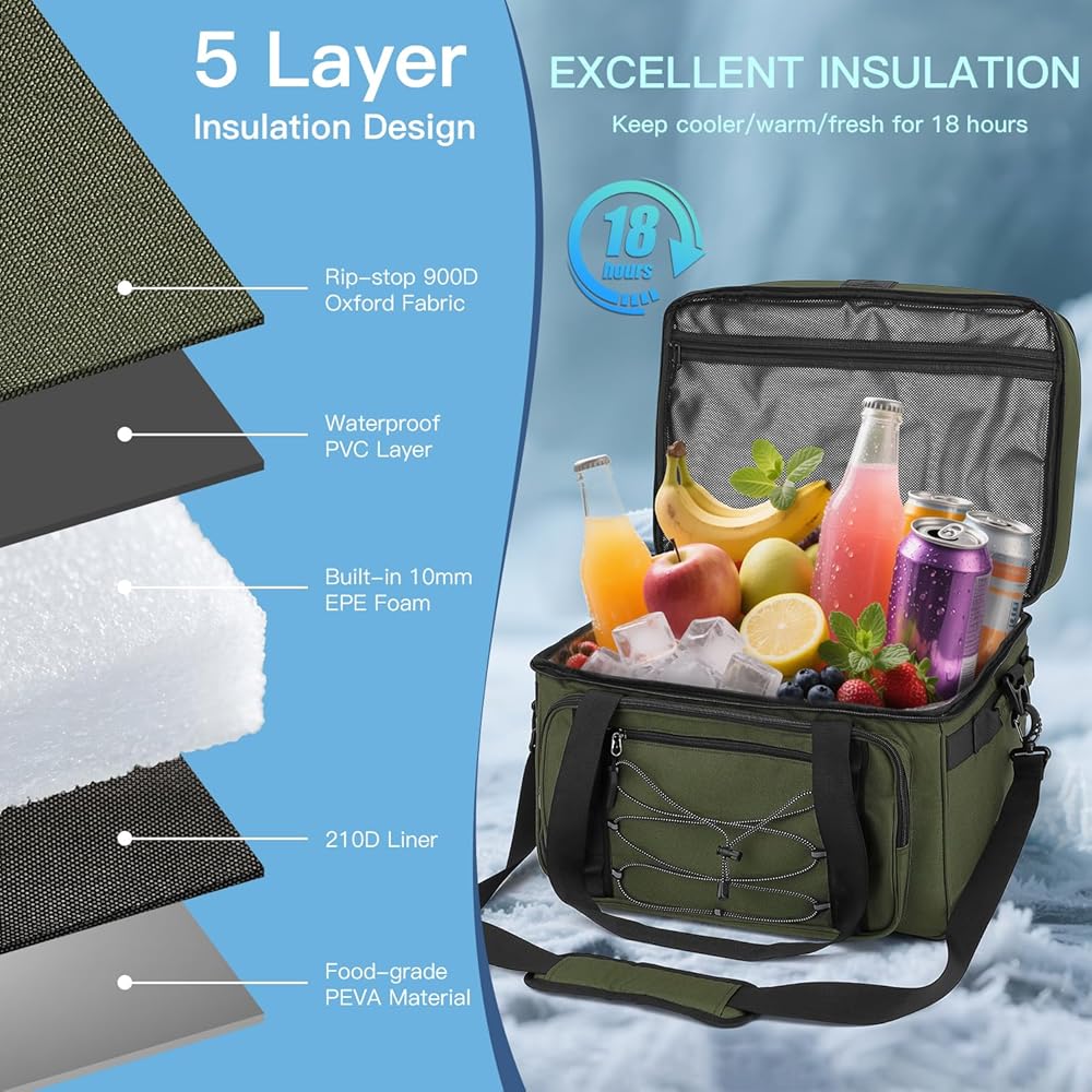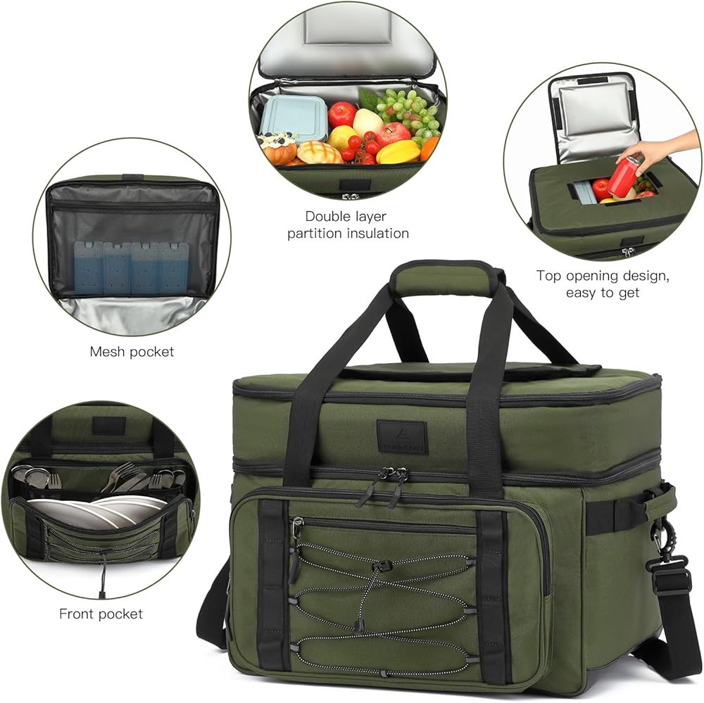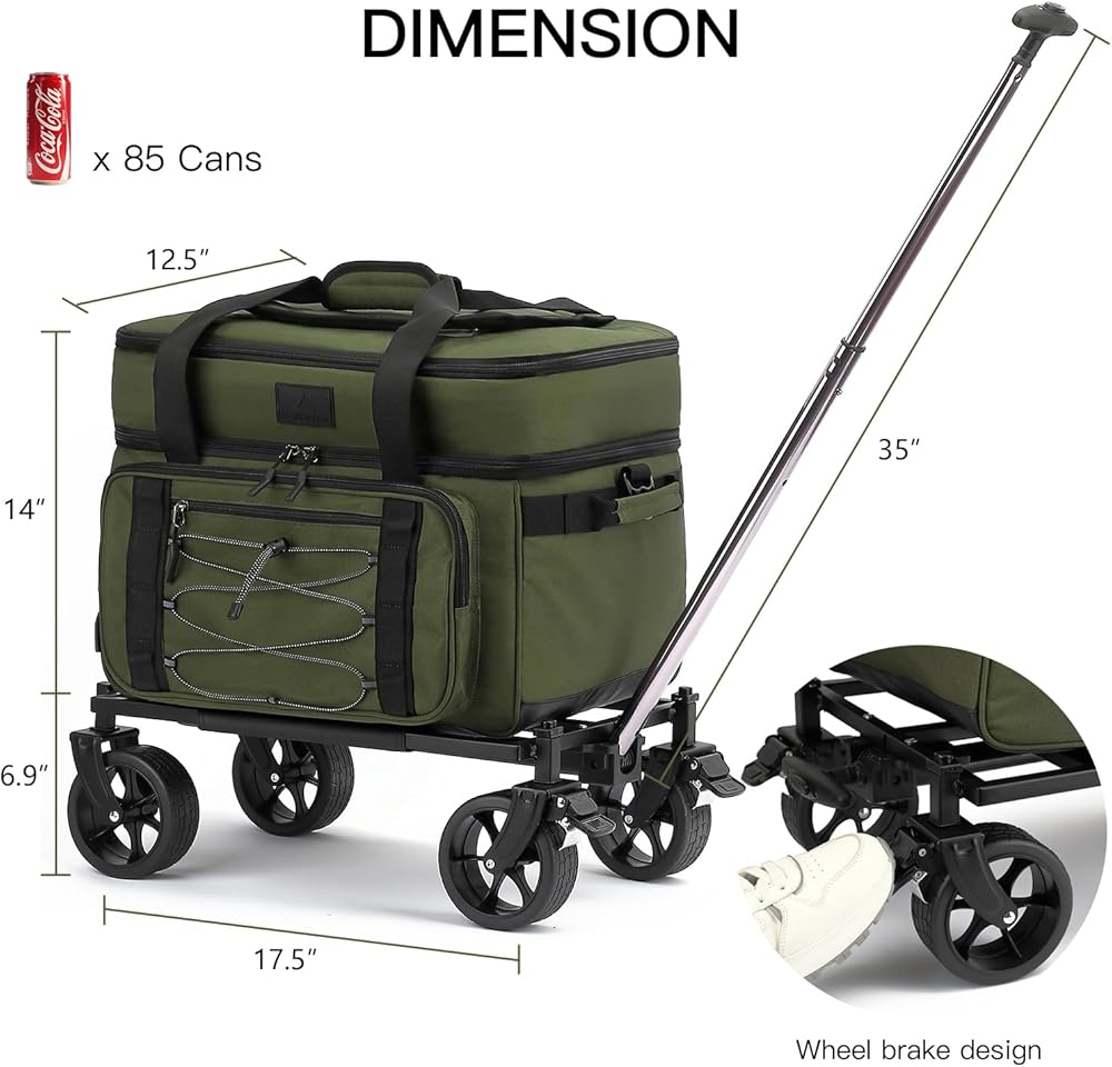 【Mega Capacity Double Decker Design】: 50L insulated wheeld cooler bag holds 85 cans, dimensions: 17.5"x12.5"x14", with dual-layer organization - top compartment for food/pizza storage, bottom insulated compartment for maximum ice retentio to keep fruit beer drink wine.