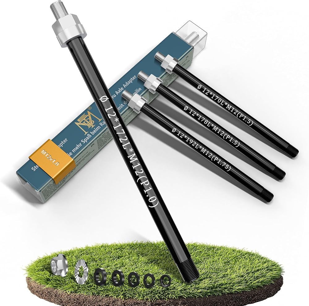 【تذكير دافئ】 هذا محول المحور من خلال M12 x 1.0 (القطر 12 مم ، مسافة الخيط 1.0 مم). طول المحور من خلال قابلة للتعديل ونطاق التعديل هو 160-172 مم. قبل الشراء ، يرجى قياس طول العمود الأصلي والتحقق من تباعد الخيط.