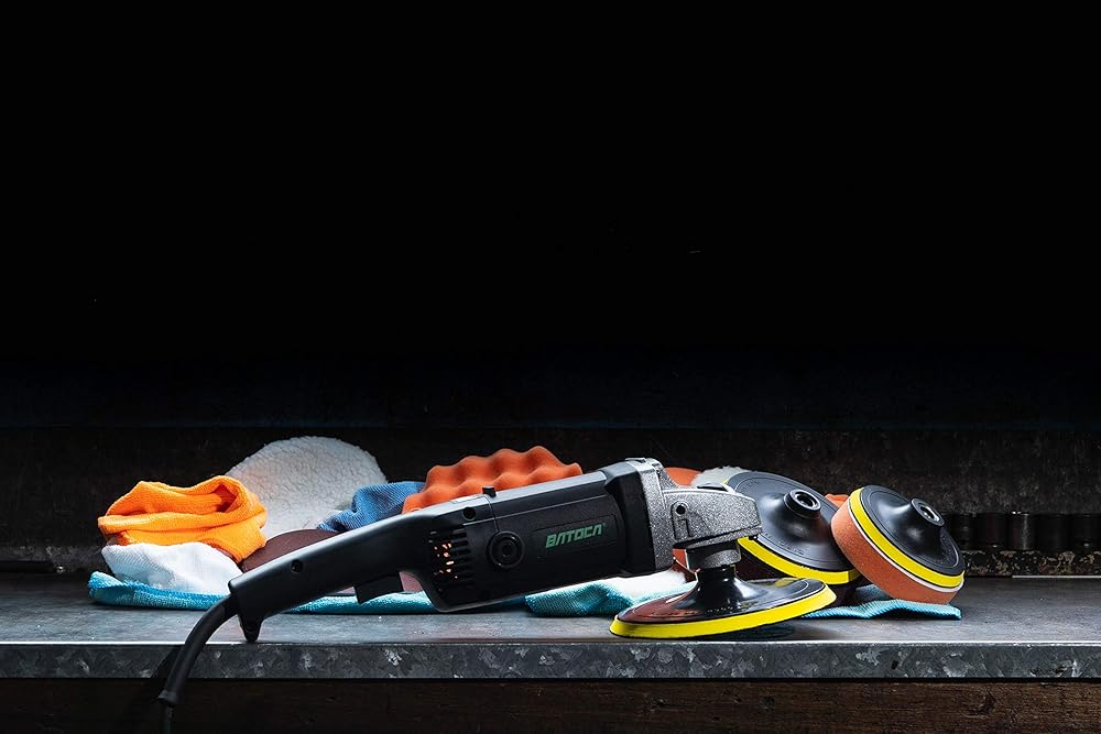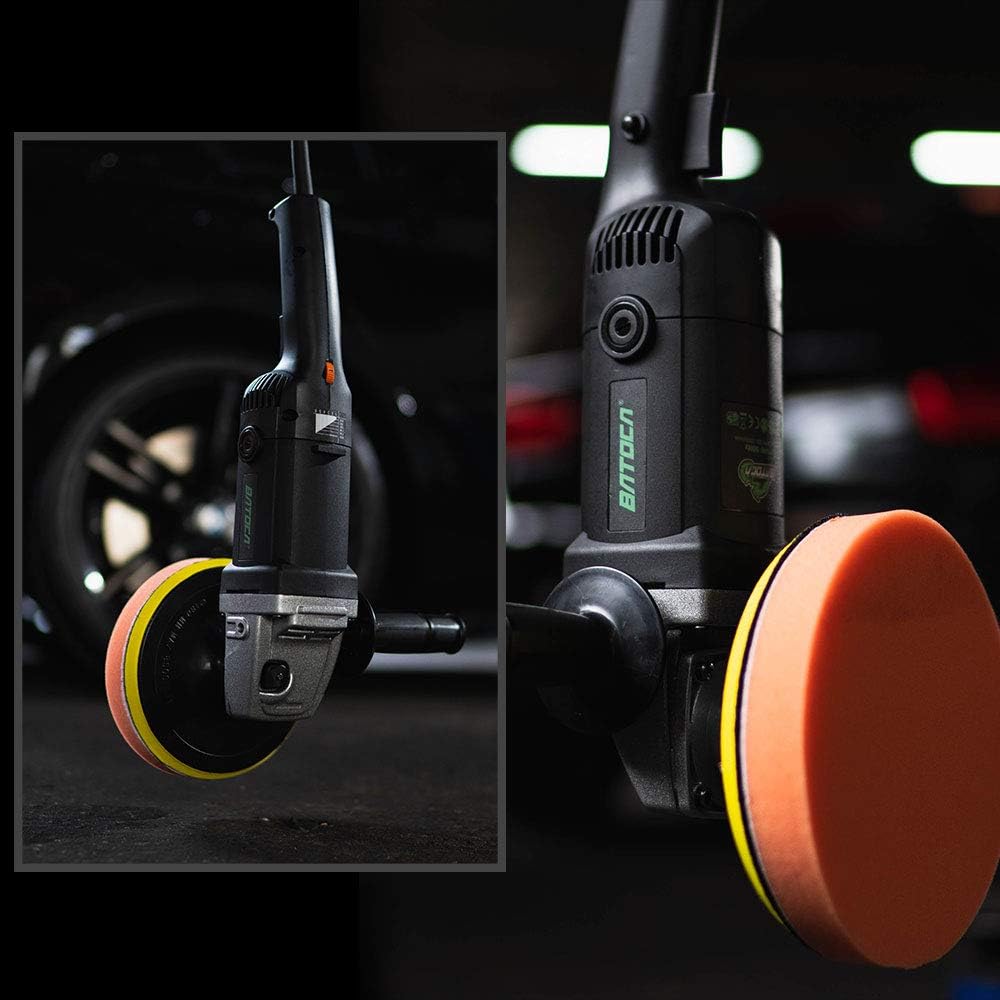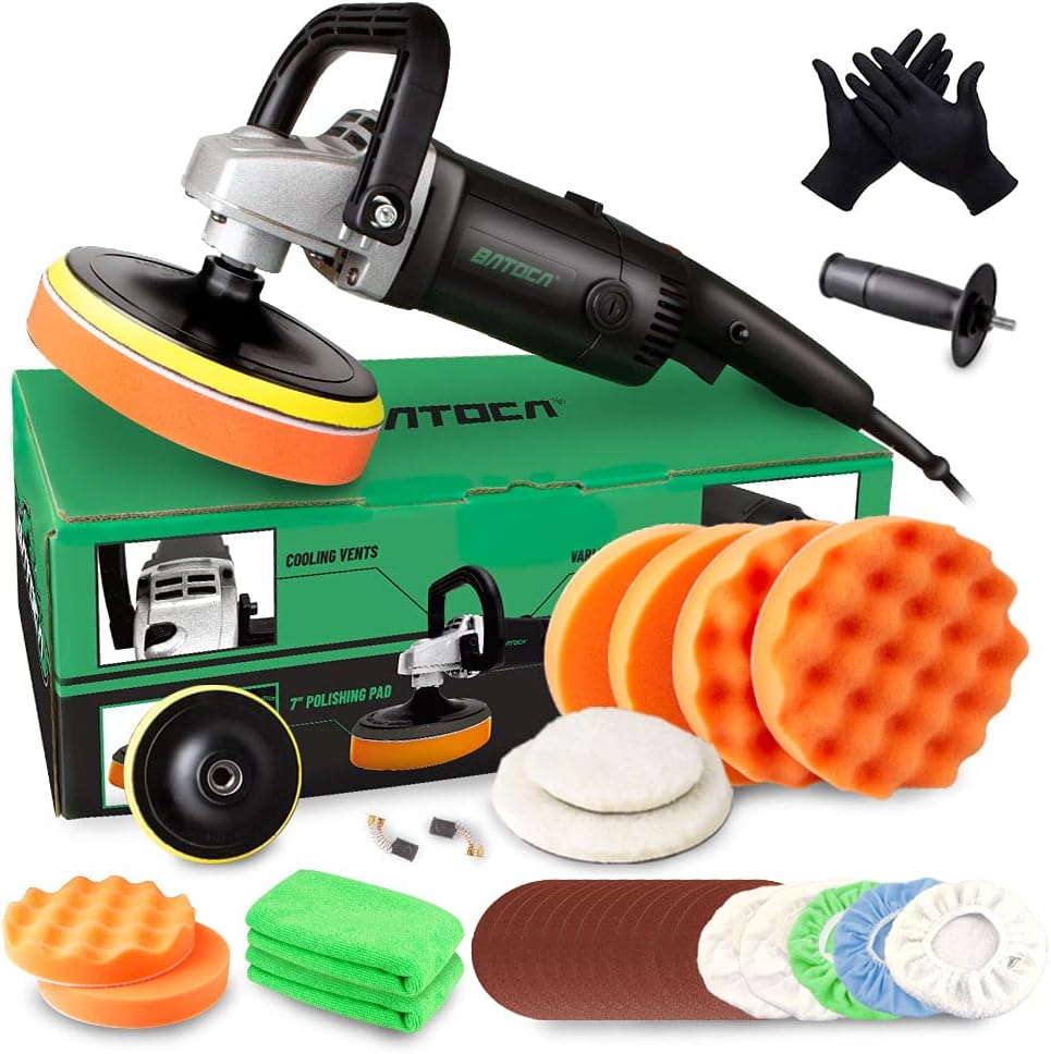 ملمع باتوكا - ملمع سيارة دوار - آلة شمع، مجموعة تفاصيل السيارة، 7 بوصة 180 مم / 1200 وات، 6 سرعات متغيرة تصل إلى 3000 دورة في الدقيقة مع وسادات إسفنجية، وسادات صوف لمخازن السيارات وملمعاتها