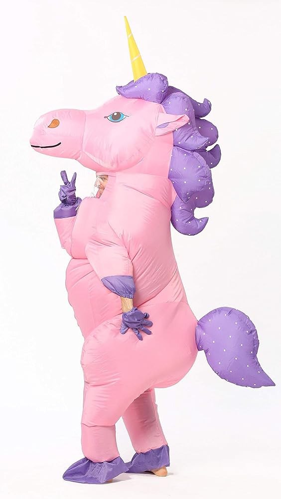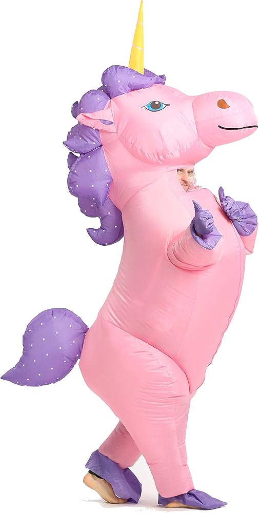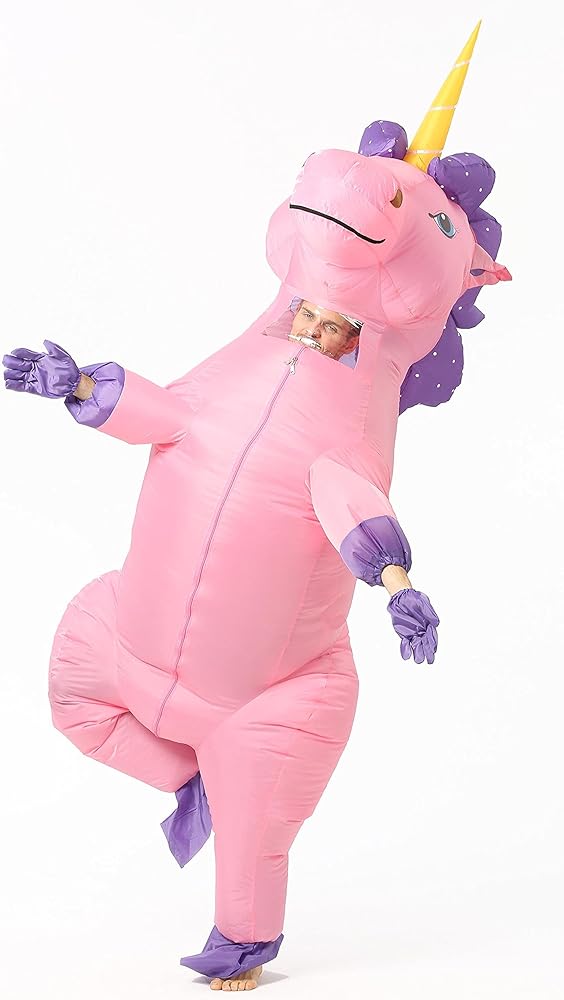 This fun and playful inflatable unicorn costume is perfect for any magical occasion. Lightweight and easy to wear with a front zipper for quick on and off, you'll be transformed into your favorite mythical creature in no time. Large see-through panels on the costume allow full visibility so you can move freely without worrying about bumping into things. The included electric pump inflates the costume quickly and easily with no complicated setup - just point and pump to become an instant unicorn! This is a blow up unicorn costume. Comfortable and stretchy, the one size fits most design means everyone can join in the fantastical fun. Suitable for theme parties, Halloween, birthdays or any time fairytales come to life, this inflatable unicorn is a delightfully whimsical choice.