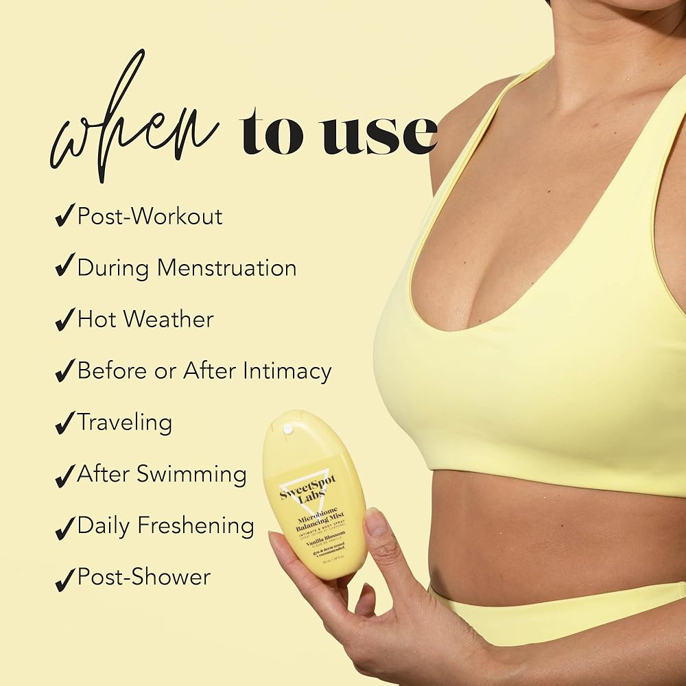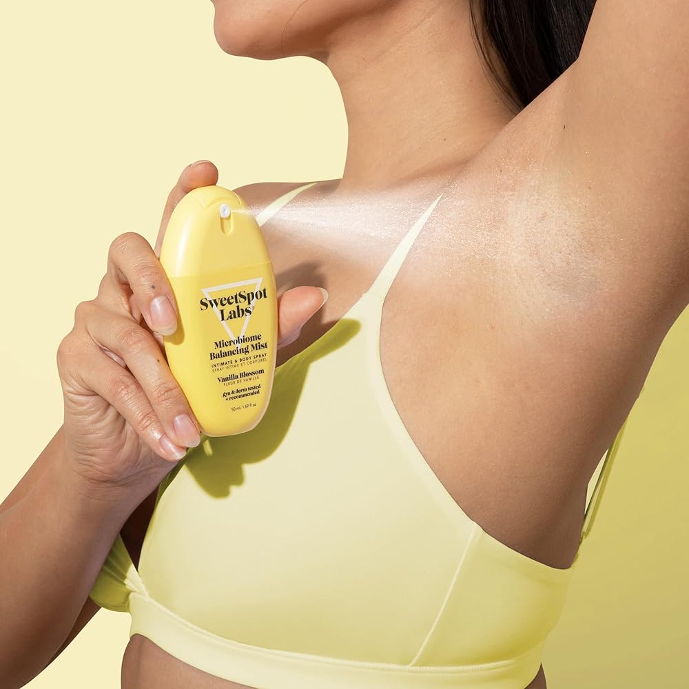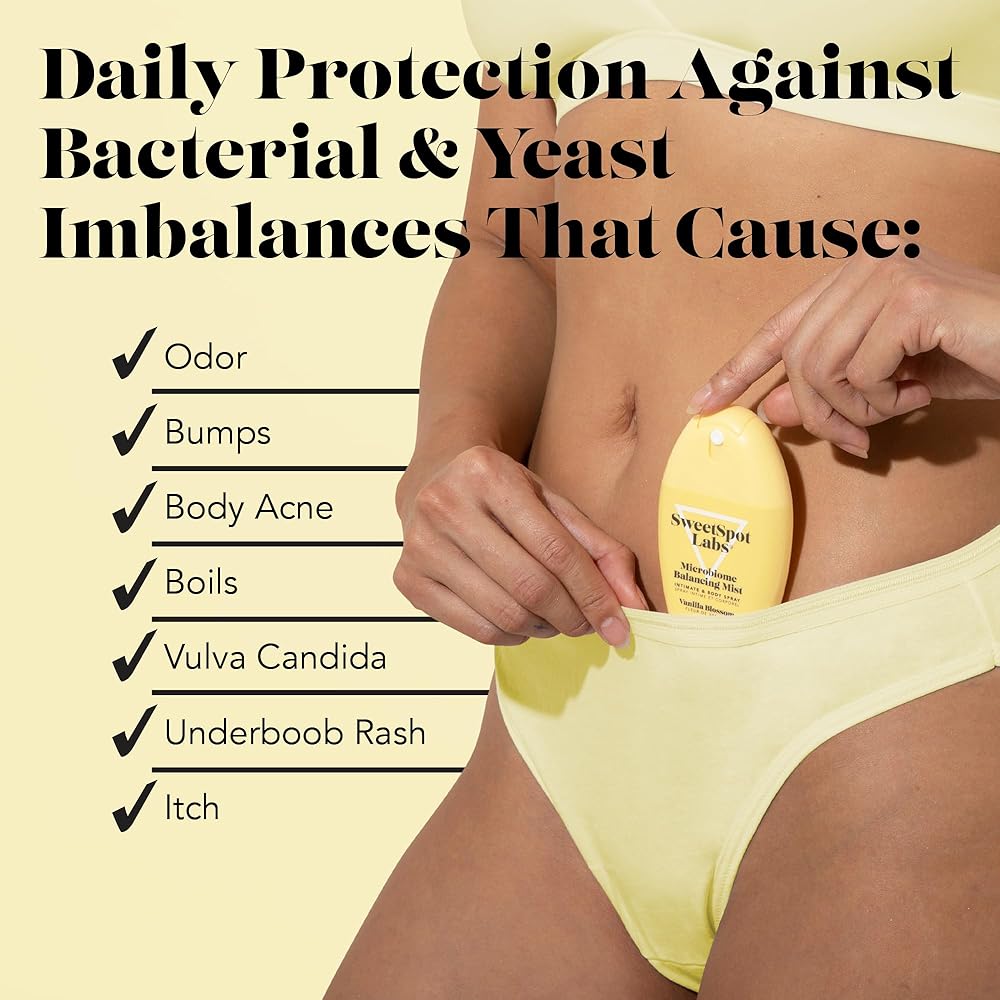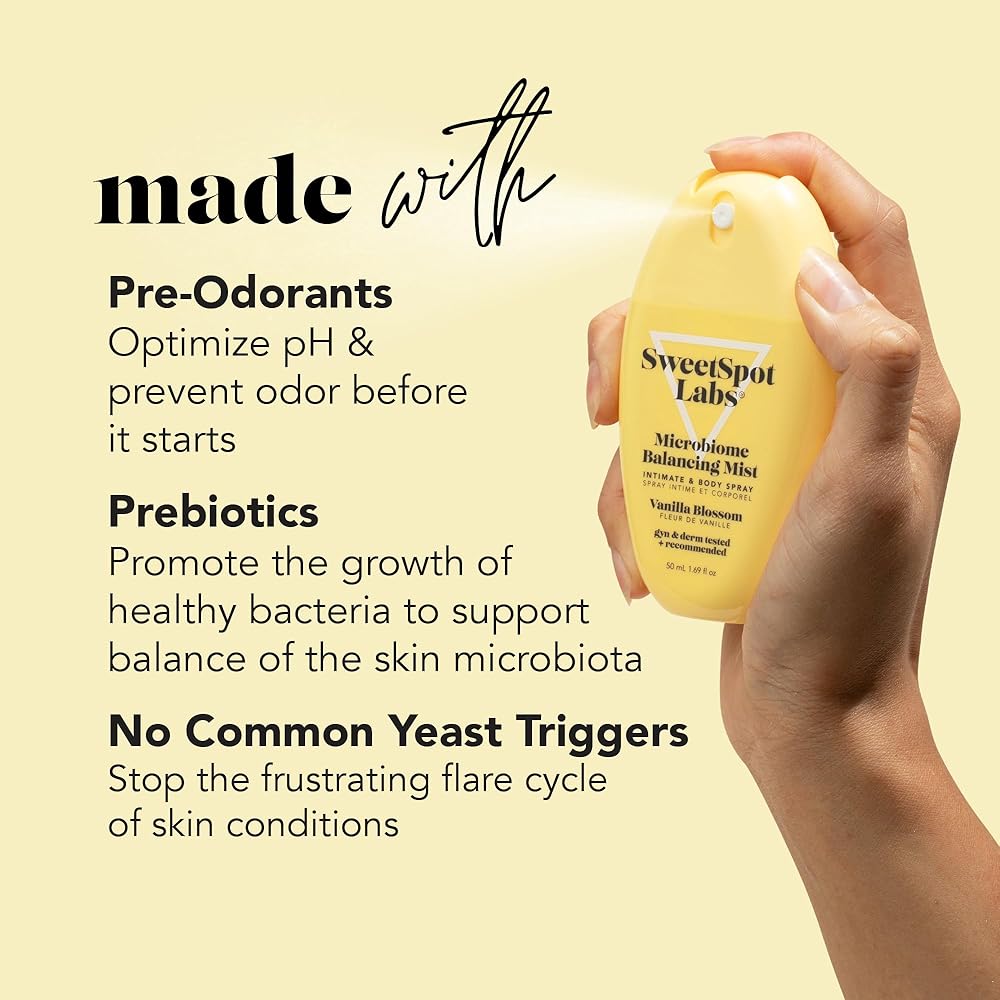 What Causes Intimate Odor? Despite common myths, the vagina is not responsible for odor below the belt. Odor can develop anywhere on the body due to sweat and environmental factors. How Does Vanilla Blossom Microbiome Balancing Spray Help with Odor? This microbiome-friendly mist combines prebiotics and pre-odorants to neutralize odor before it starts—without masking it with harsh fragrances. What Causes Imbalance? pH imbalance is often triggered by external factors like harsh soaps, and even tight clothing. When your pH is off-balance, you're more prone to irritation, odor, and breakouts. How Does Vanilla Blossom Microbiome Balancing Spray Help with Imbalance? This formula is pH-optimized (4.5 - 5.5) and made without common yeast triggers to help maintain a balanced, healthy skin microbiota. Can I Use Vanilla Blossom Microbiome Balancing Spray Every Day? Yes! It's designed for daily use to refresh and protect intimate and sensitive skin. Simply spritz and go! Is It Safe for Sensitive Skin? Absolutely. It's hypoallergenic, pH-balanced, and free from alcohol, parabens, sulfates, and common irritants, making it safe for even the most delicate areas. Can I Use It on My Underarms? Yes! While formulated for intimate skin, it's safe to use anywhere externally. It's great for freshening up underarms, thigh creases, feet, or anywhere you need a quick refresh.