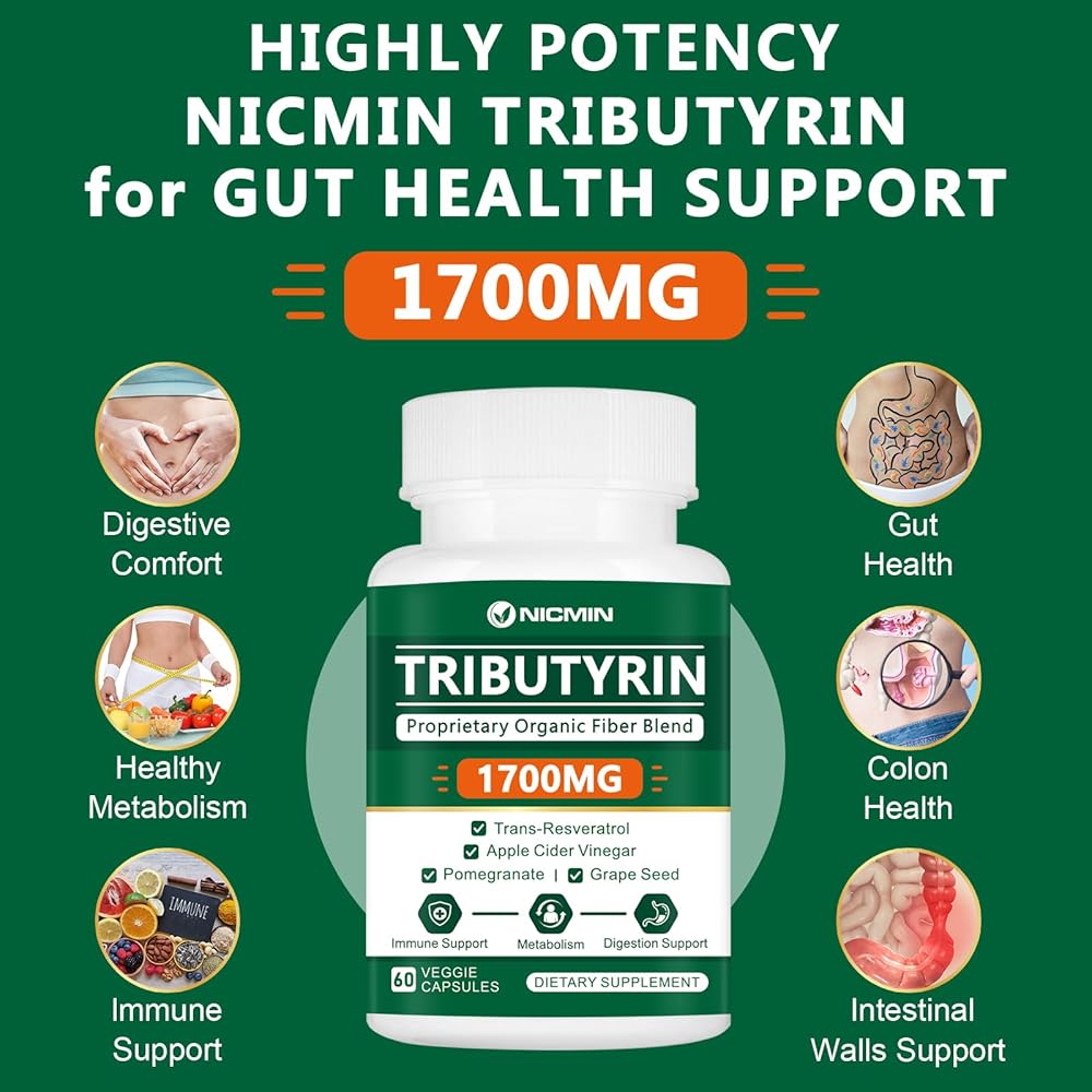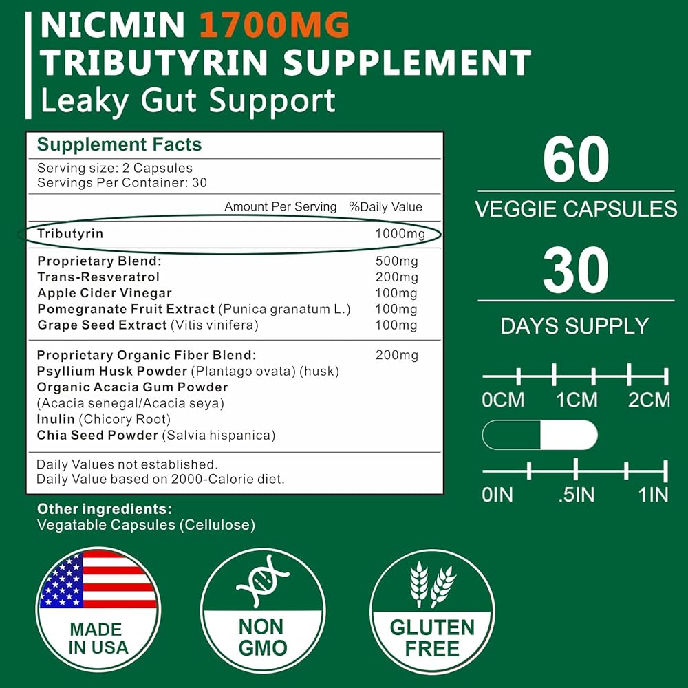 • ملحق Tributyrin 1700mg: يوفر Nicmin 1000mg Tributyrin Plus 700mg مزيج للفرد في حين أن معظم مكملات Tributyrin لديها جرعات منخفضة من ترينبرين 500 ملغ.