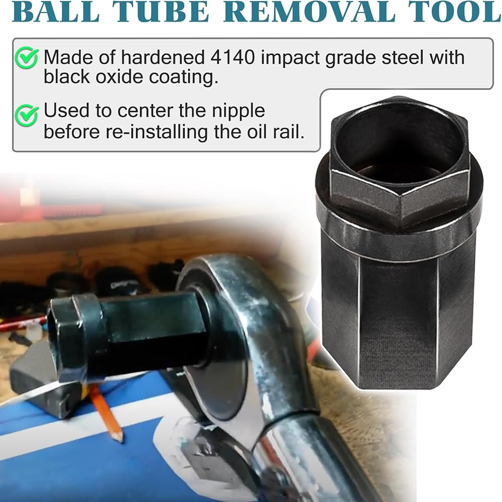 BALL TUBE REMOVAL TOOL: Made of hardened 4140 impact grade steel with black oxide coating. Used to center the nipple before re-installing the oil rail