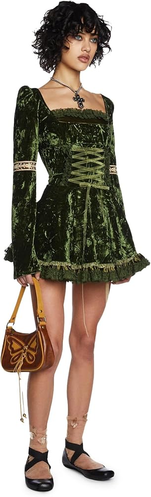 Enchanting Fantasy Style – A green velour mini dress with puff sleeves, embroidered metallic ribbon, and satin lace detailing for a whimsical, fairytale look.