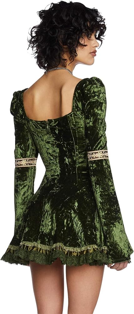 Unleash fantasy and elegance with the Myths N' Legends Mini Dress, a stunning green velour mini dress designed for those who love whimsical fashion with a fairytale twist. Crafted from soft, stretchy velour fabric (95% Polyester, 5% Spandex), this dress offers a flattering, body-hugging fit while ensuring all-day comfort. The lace-up front allows for a customizable look, while embroidered metallic ribbon trim and delicate satin lace detailing bring an enchanted, vintage-inspired feel. Complete with long puff sleeves and a tulle petticoat, this emerald green dress adds playful volume, making it a standout choice for holiday parties, themed events, or a magical night out. With its back zip closure for easy wear, this dress blends fantasy aesthetics with effortless elegance, making it a must-have for your wardrobe