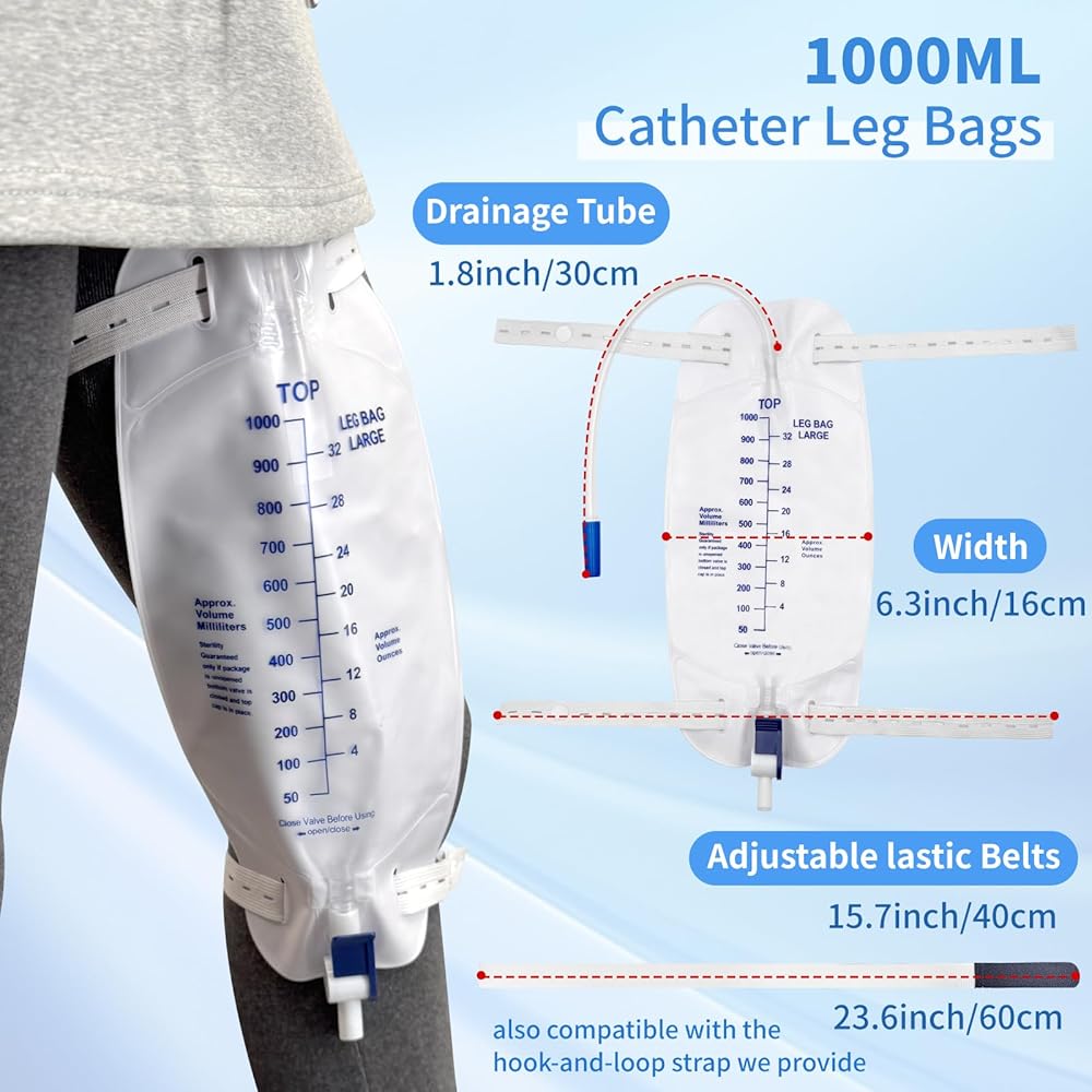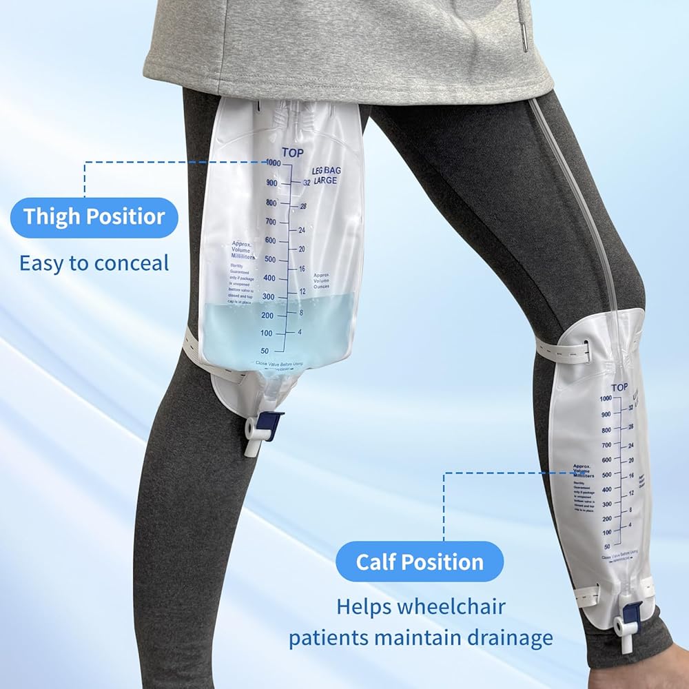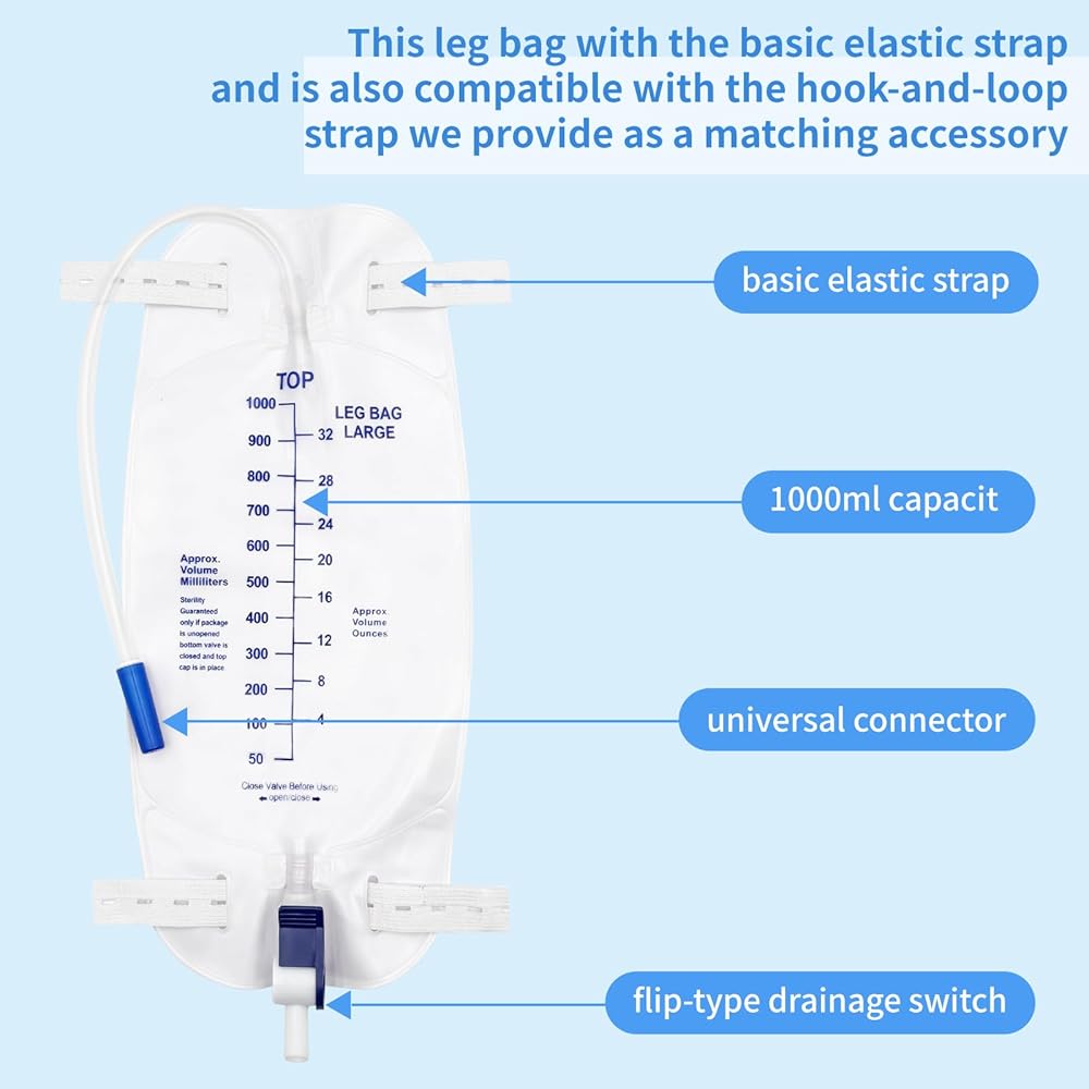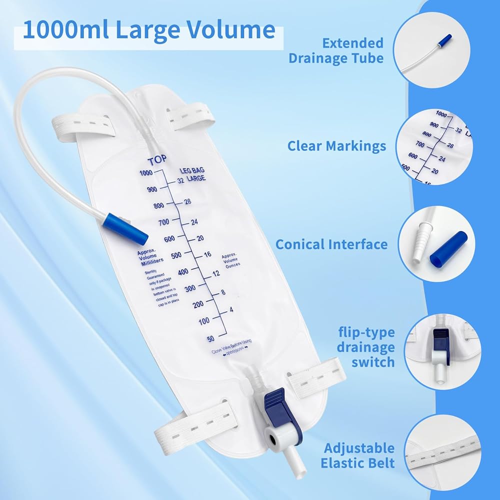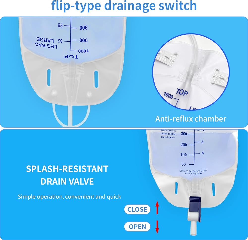 السعة: مصممة مع سعة حجم كبيرة 2000 مل (67.6 أوقية) للاستخدام الممتد دون إفراغ متكرر. غرفة مضادة للفرع: تتميز بصمام مضاد للهروب لمنع التدفق الخلفي وضمان تصريف البول المناسب. التصميم المريح: يتضمن أنبوب تصريف بحجم 48 بوصة ، ومقاطع لمرفق آمن ، وخطاف معلق لسهولة تحديد المواقع.