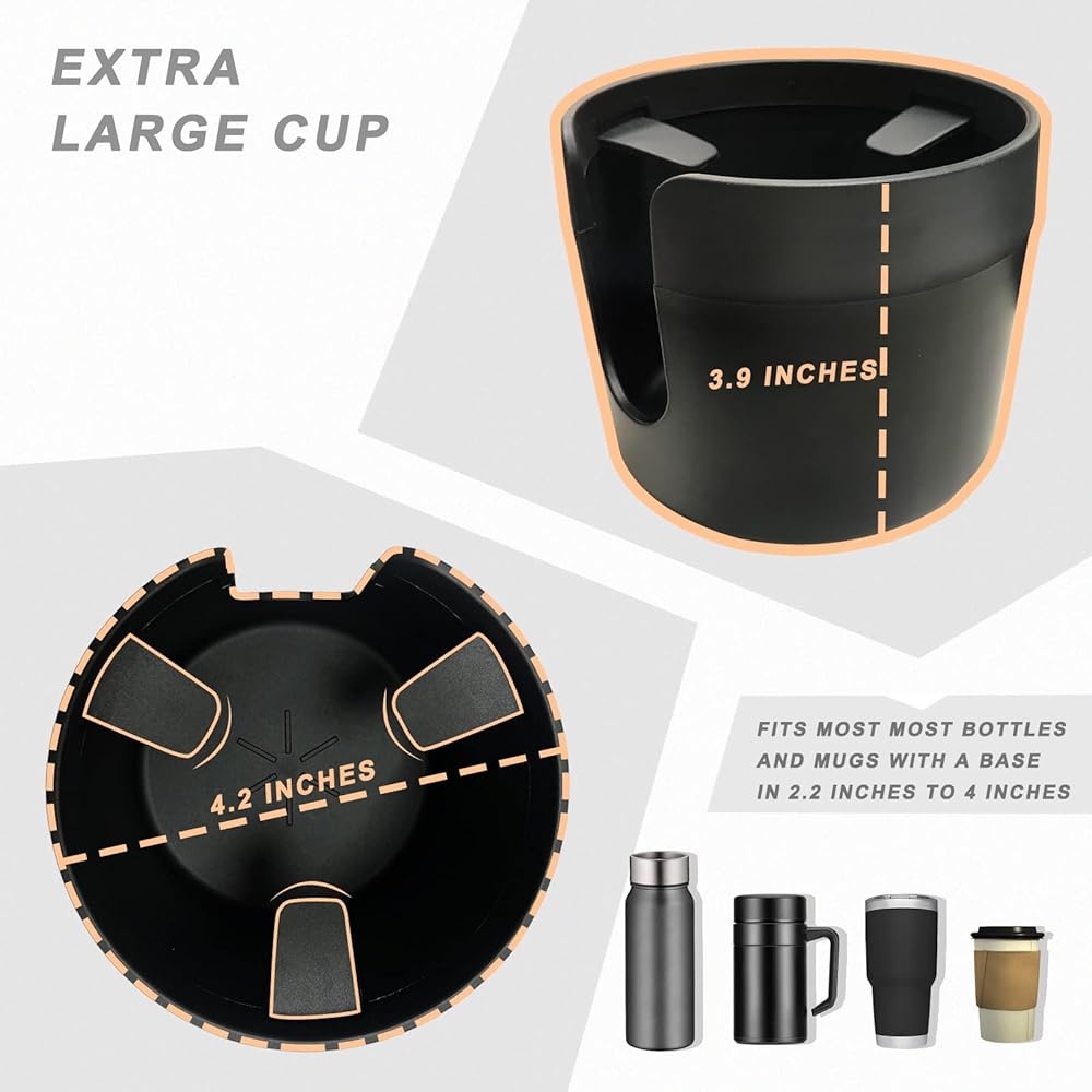 تم تصميم موسع حامل الأكواب الخاص بنا لحمل معظم الزجاجات والأكواب بقاعدة من 2.2 انش إلى 4 انش، بما في ذلك العلامات التجارية الشهيرة مثل يتي 14/24/36/48 اونصة رامبلرز وهايدرو فلاسك 32/40 اونصة وأكثر من ذلك. حامل الأكواب مصنوع من البلاستيك الصلب والسميك ويتميز بعروة مطاطية حول الجزء العلوي تثبت الكوب بإحكام في مكانه دون انقلاب أو انسكاب عند القيادة على الطريق.