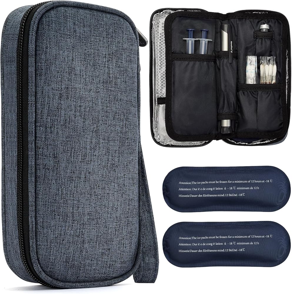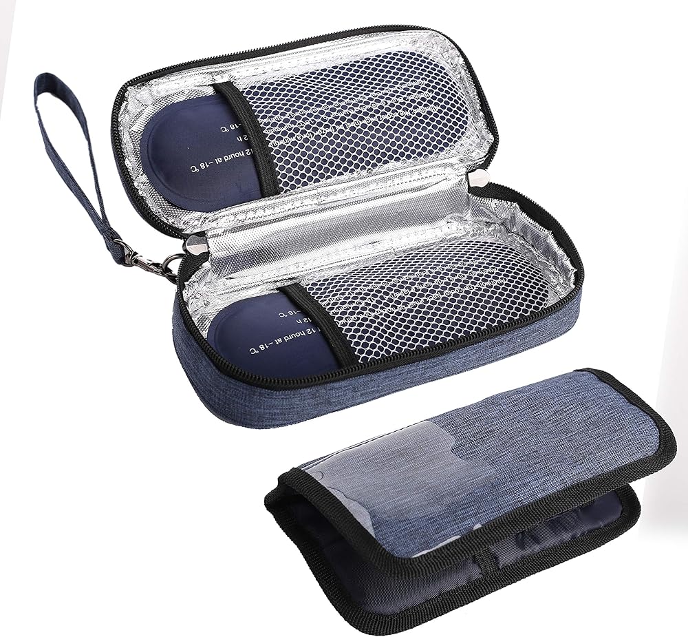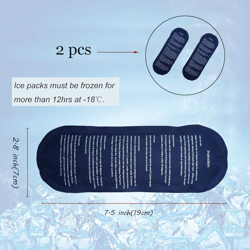 • حافظ على آمنة الأنسولين لمدة 10 ساعات مع 2 حزم الجليد هلام معتمدة من MSDS (غير سامة ، خالية من اللاتكس). تحمي بطانة العزل السميكة الأقلام/القوارير من الحرارة أثناء الرحلات أو رحلات السيارات أو أيام الشاطئ. لا حاجة للبطارية أو الحبال.