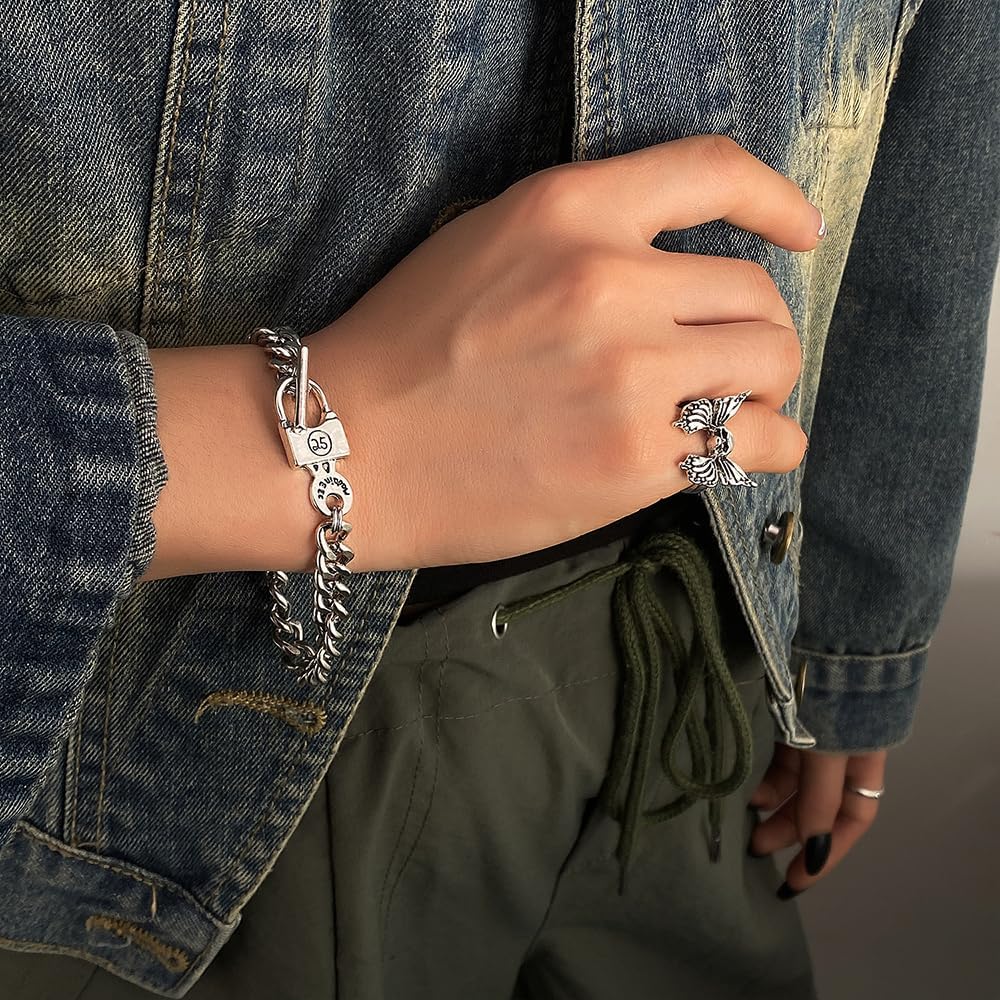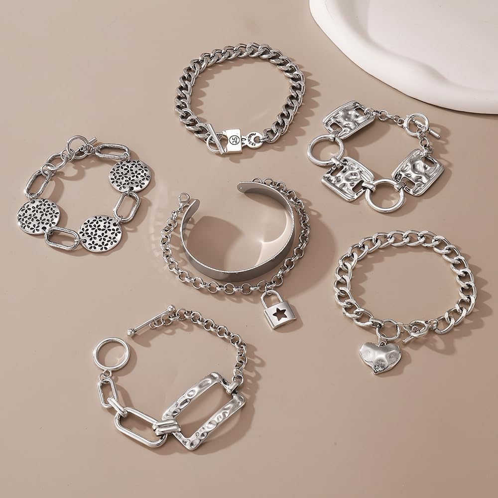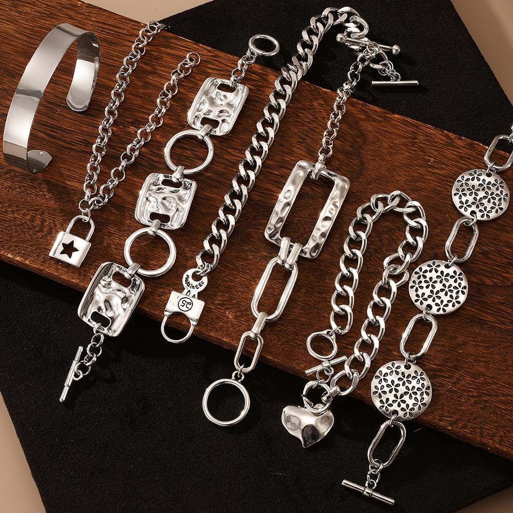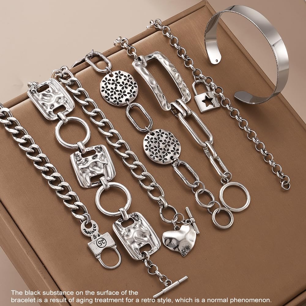 قبلة زوجة الأساور الفضية العتيقة مجموعة للنساء الرجال ، OT تبديل سوار قفل ، قفل القلب مجوفة المطبوعات أساور مكتنزة سلسلة كوبية