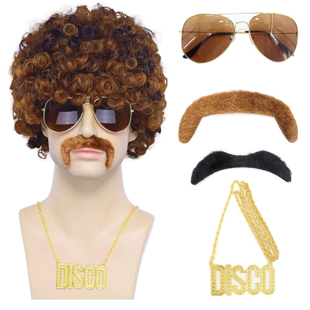 ديسكو شعر مستعار للرجال، مجموعة 6 قطع 70s 80s ديسكو شعر مستعار للرجال مع نظارات وقلادة وشارب، شعر مستعار قصير مجعد أفرو للرجال من أجل هيبي روك مضحك كوسبلاي الهالوين وحفلات عيد الميلاد