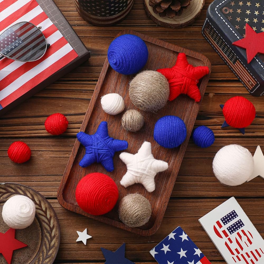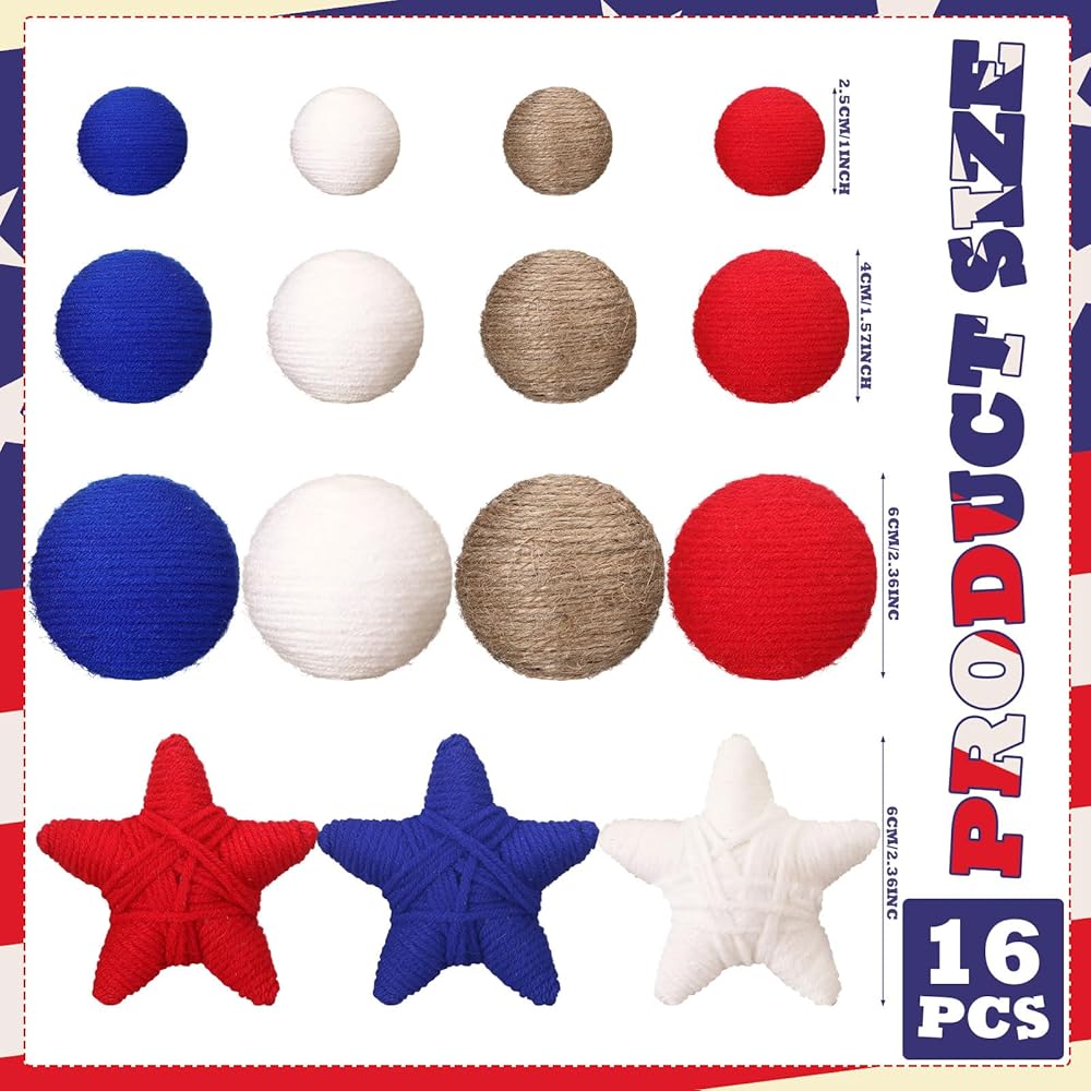SYHOIDE 16 PCS 3 أحجام 4 يوليو كرات زخرفية ريفي وطني خيوط الحبل كرات الديكور الأحمر الأبيض النجوم النبائية التذكارية يوم الاستقلال ديكور الجدول المنزلي لـ DIY Craft Vase Bowler