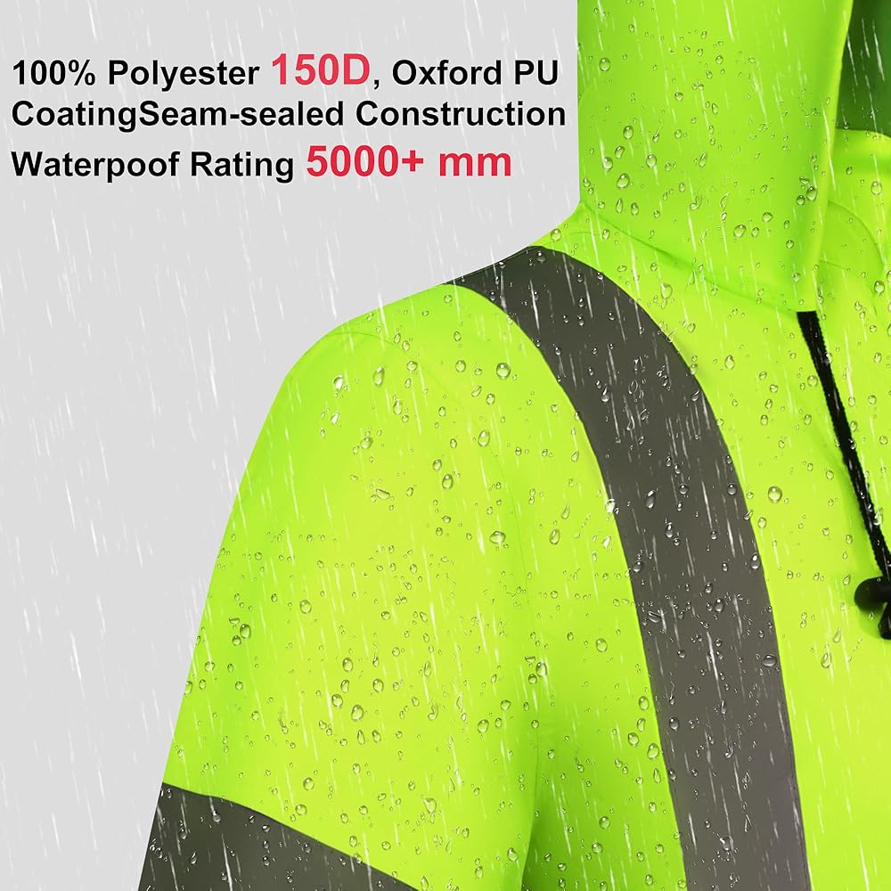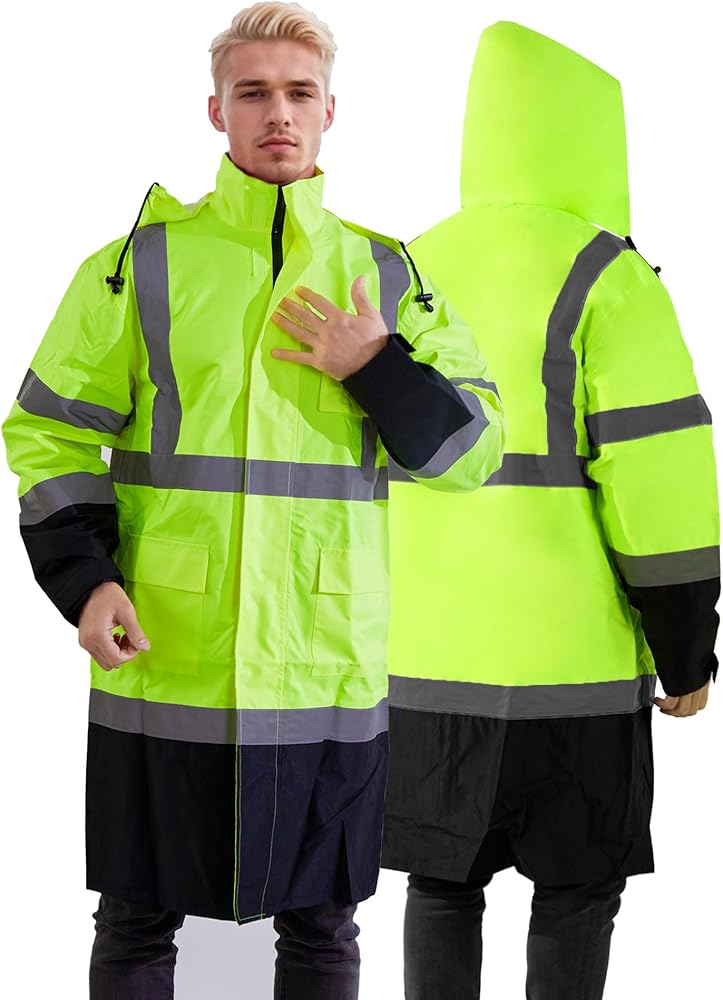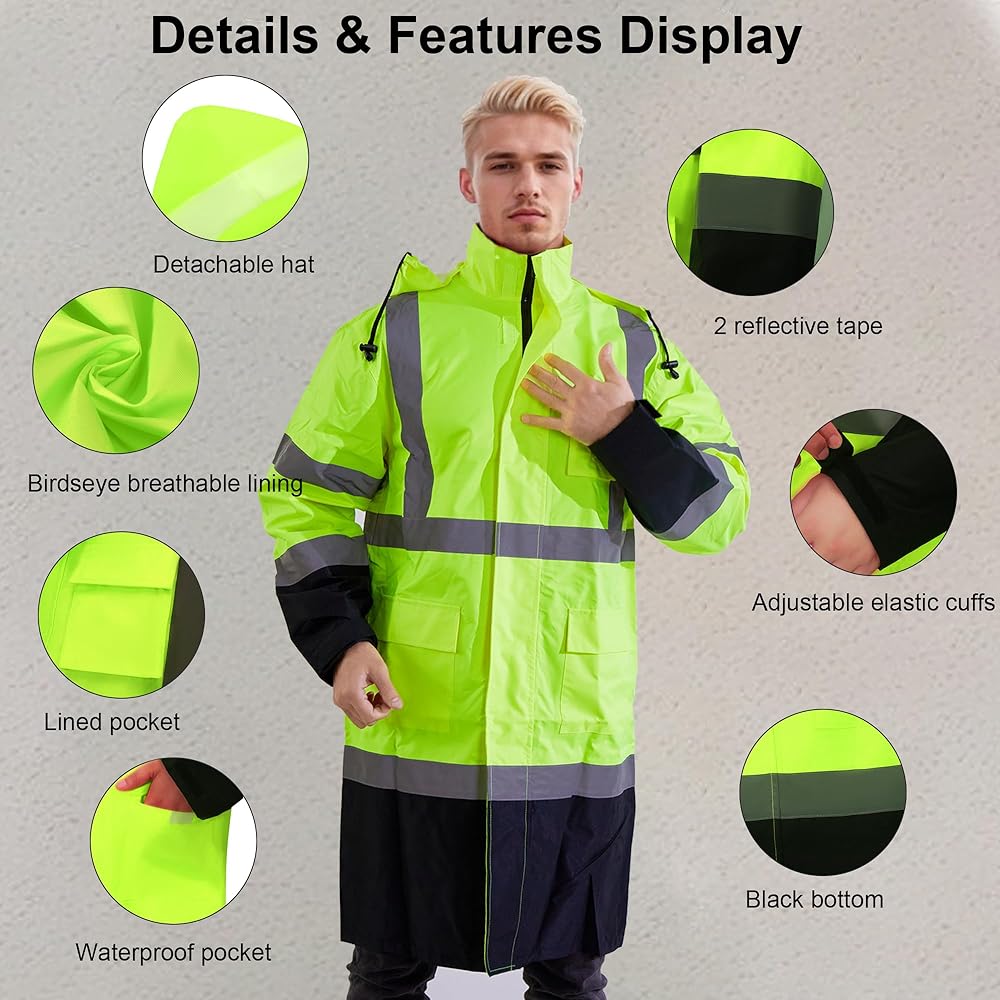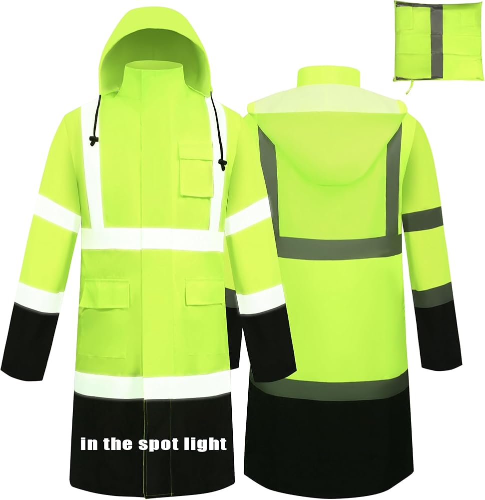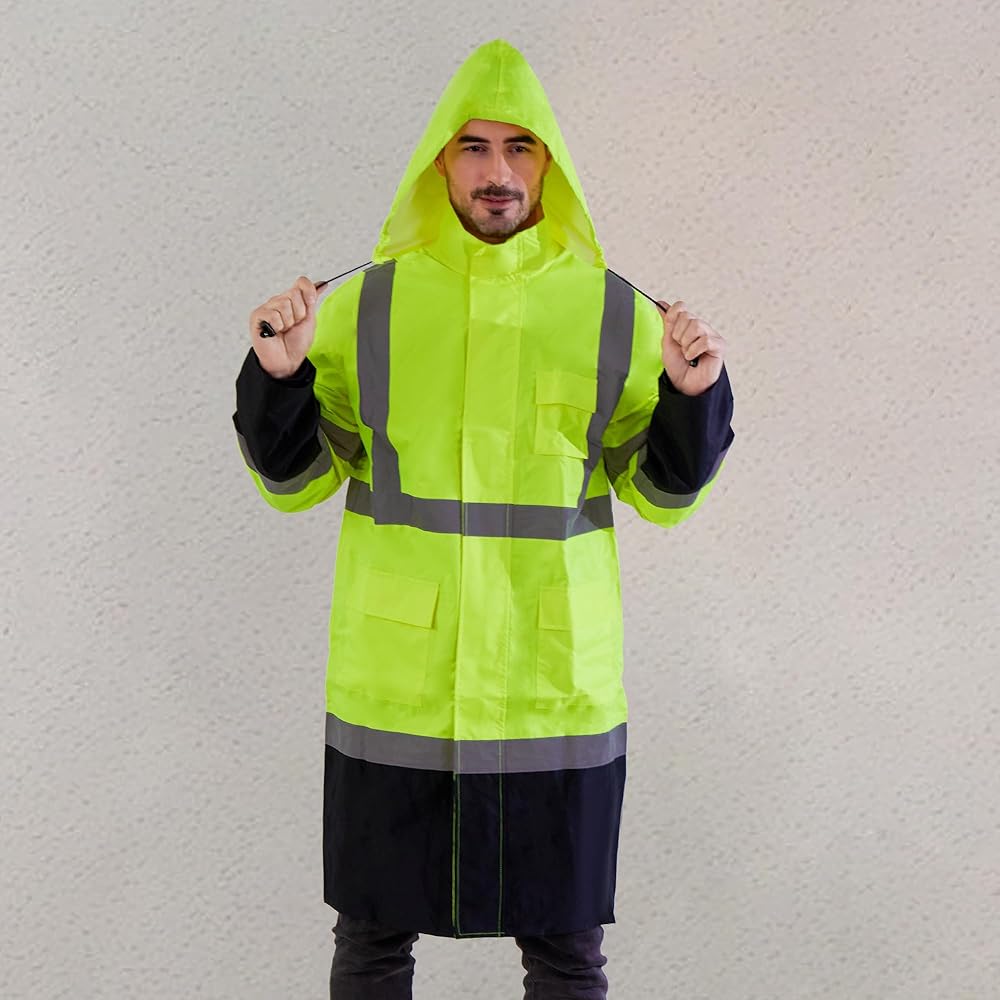معطف المطر العالي: تتكون سترة أمطار السلامة من المواد الصفراء/الوردية الفلورية والتي تنطبق في أي موقف يجب أن يتم فيه تعزيز الرؤية والسلامة ، خاصة خلال الظروف الليلية أو الإضاءة المنخفضة. إنه يتميز بشريطان عموديان و 2 "أفقي 2 بوصة عاكسة على المقدمة والخلف والكتفين ، و 4 دوائر على الأكمام الطويلة لتحقيق أقصى قدر من الانعكاس والرؤية