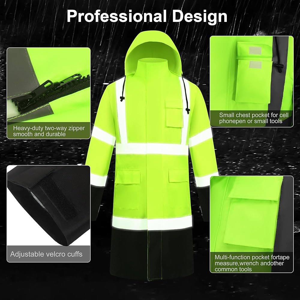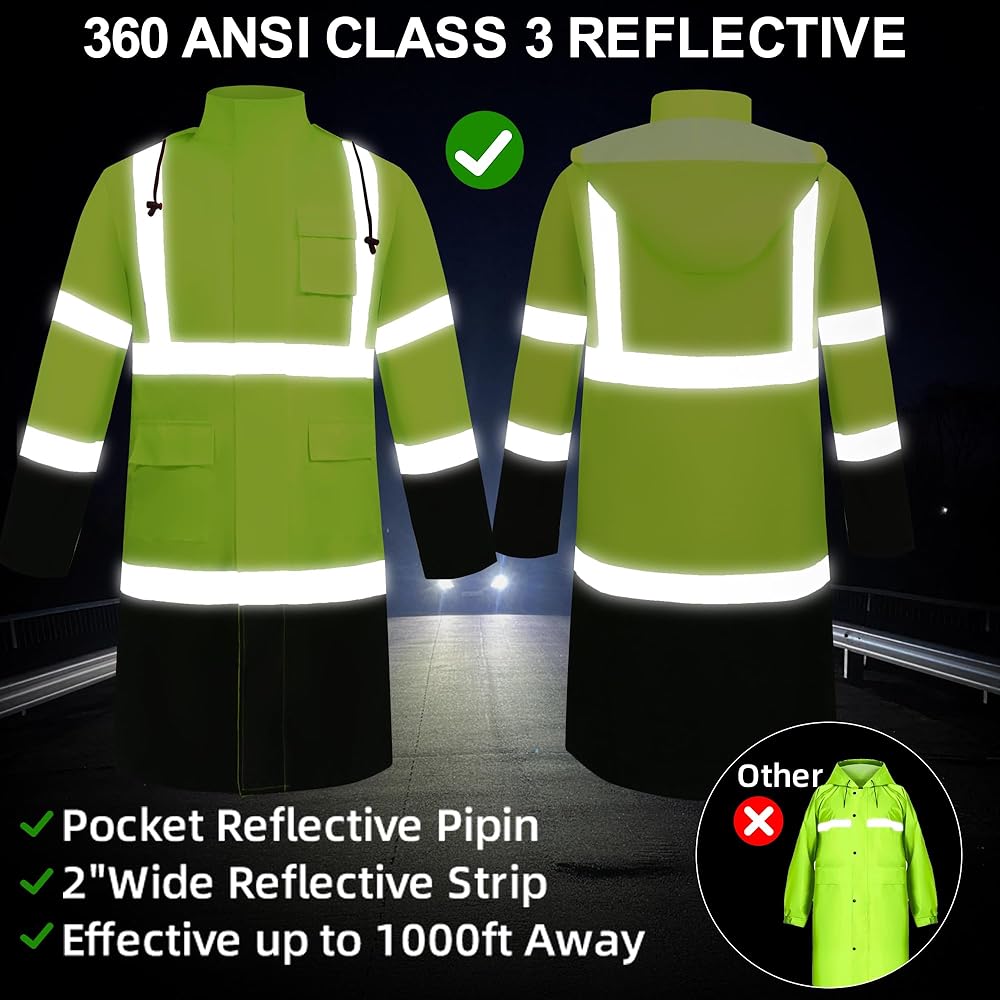 مريح وعملي: تم تجهيز معطفات المطر من العمل مع خطوط عاكسة للمعطف المطرور العالي الرؤية التي تتوافق مع معايير ANSI. تغطي الخطوط الفضية العالية العاكسة بعرض 2 بوصة الكتفين والخصر والظهر والذراعين. يضم الجزء الخارجي 2 جيوب ، غطاء محرك الأقراص.