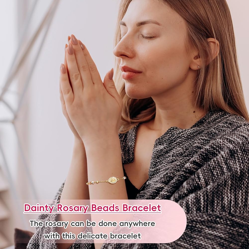 • 【Dainty Rosary Bracelet】Show your spiritual side with this shiny 14K gold rosary bracelet, featuring an inlay cubic zirconia Miraculous Medal of the Virgin Mary, a polished cross charm and 3 color rosary beads. This catholic rosary bracelet is a perfect blend of faith and fashion, suitable for any occasion. Looks just as beautiful with jeans and a t-shirt as it does with dressy attire. Wear alone or layered with other chains