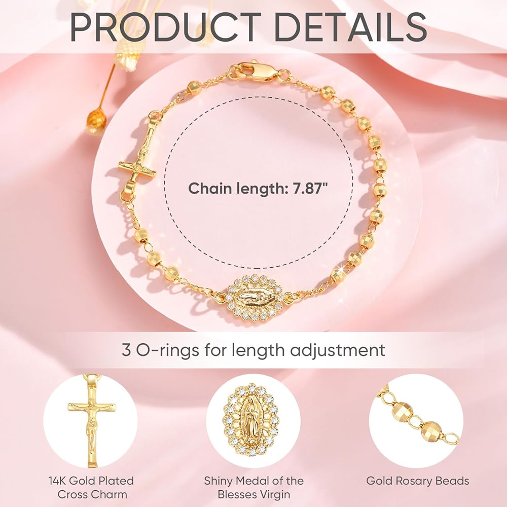 • 【14k Gold Rosary Bracelet】This rosary beads bracelet is made of brass plated with 14k gold for added durability. the bracelet is highly polished to make the surface smooth and the pattern delicate. This Virgen de Guadalupe bracelet is hypoallergenic and nickel-free making this a great choice for those with very sensitive skin and does not irritate your skin