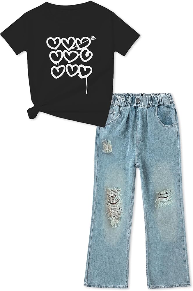 Artmine Girls '2 قطعة من قطعة القلب تي شيرت وسروال جينز الساق الواسعة الساق in Kuwait