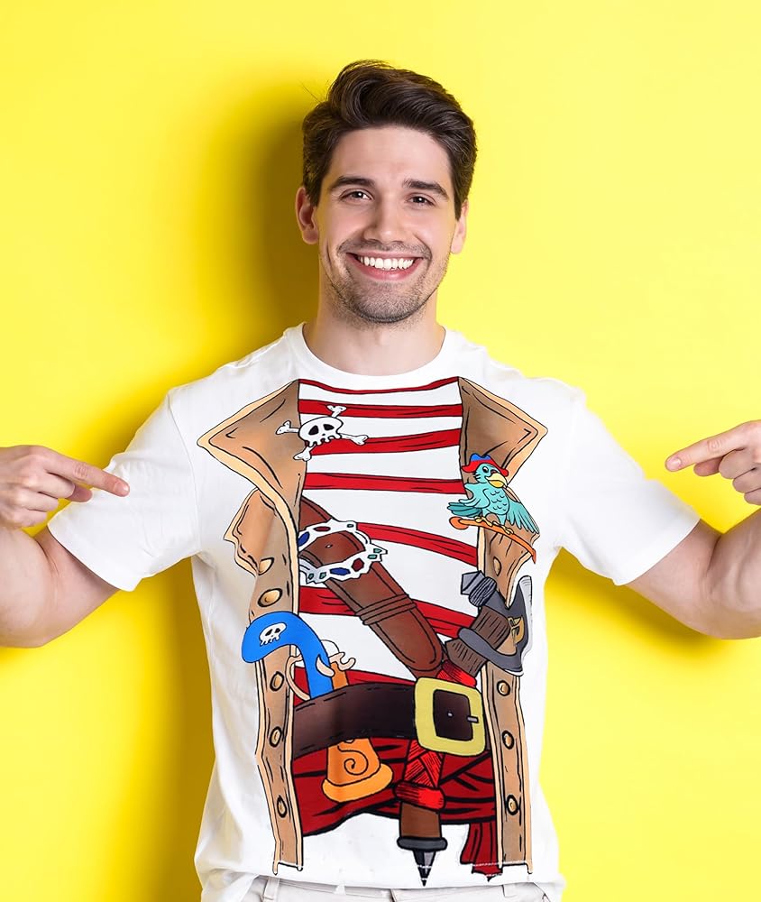 【ارتداء القراصنة متعددة الاستخدامات】 The Pirate - thirate t -shirt يثري خزانة ملابسك أو قمم المراهقين بسهولة مع الجينز أو السراويل القصيرة غير الرسمية للارتداء اليومي. للحفلات ذات الطابع أو المناسبات الخاصة ، قم بإكسسواراتها مع قبعة باندانا أو تريكورن أو حزام جلدي. مثالي لأزياء القراصنة العائلية ، فإنه يتيح للعائلة بأكملها مشاركة روح القراصنة.