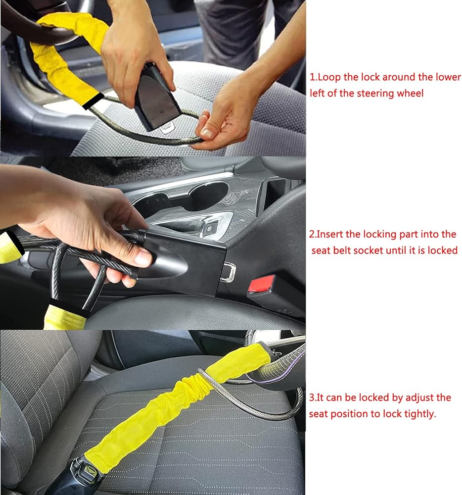 • 【عالمي وقابل للتعديل】قفل حزام الأمان المضاد للسرقة يناسب معظم السيارات والشاحنات والشاحنات الصغيرة وسيارات الدفع الرباعي وعربات الجولف. الحد الأقصى لطول الكابل الفولاذي 17 بوصة طويل بما يكفي لضبط قفل عجلة القيادة ومقعد السيارة بإحكام.
