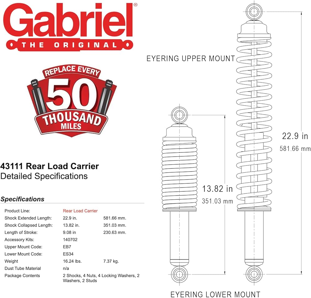 يجمع مساعد الزنبرك الأمامي والخلفي (حامل الحمل) من غابريل بين تقنية الصدمات والزنبرك لتقليل فقدان ارتفاع الركوب في ظروف التحميل المستمرة. يمكن أن تساعد النوابض الملفوفة الأمامية ذات المعدل الثابت على تحسين الثبات واستعادة أو الحفاظ على ارتفاع الركوب، بينما توفر الزنبركات الملفوفة الخلفية ذات المعدل المتغير 500 باوند. لكل زوج من سعة التحميل [لا يتجاوز معدل الوزن الإجمالي للمركبة). المنتج لا يزيد من الحمولة]. ومثل جميع صدمات ودعامات غابريل ، يتميز مساعد الزنبرك الأمامي والخلفي بقضيب مكبس مطلي بالكروم فائق الجودة لمقاومة فائقة للتآكل وختم مكبس مانع للتسرب مما يطيل عمر المنتج.