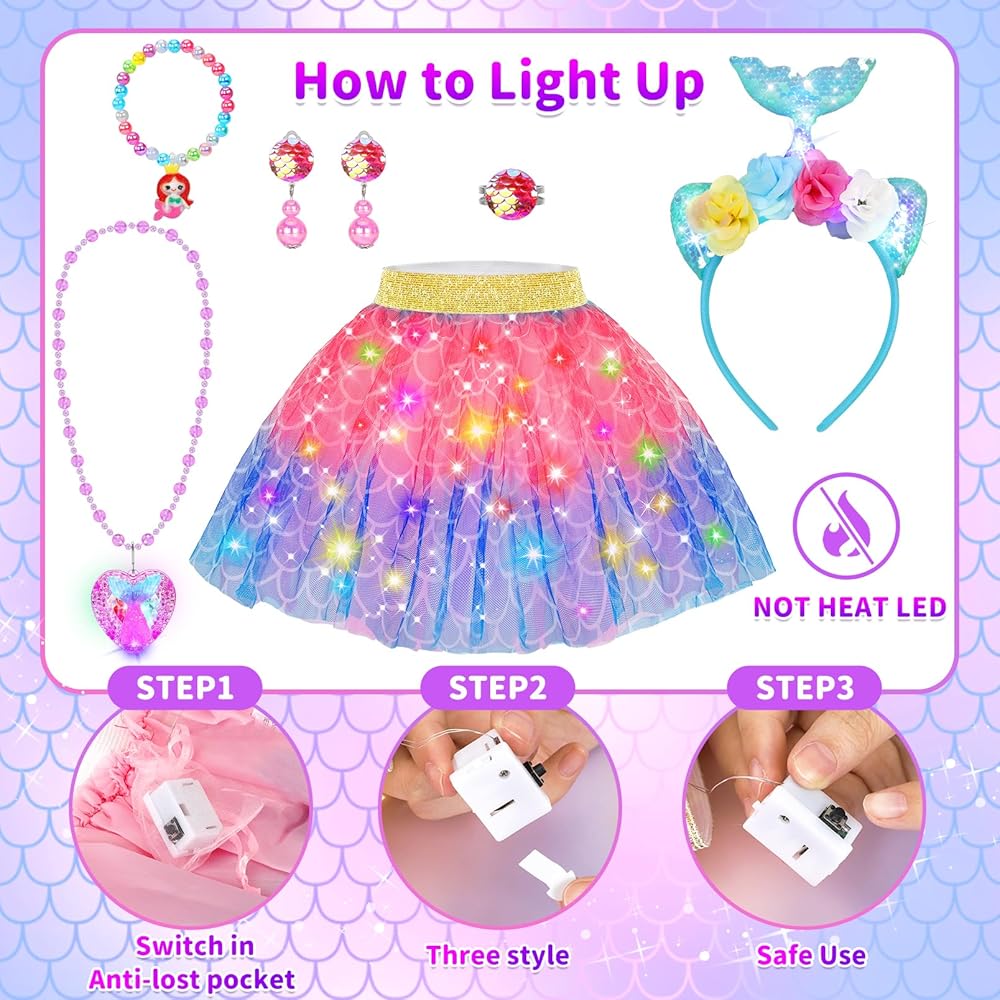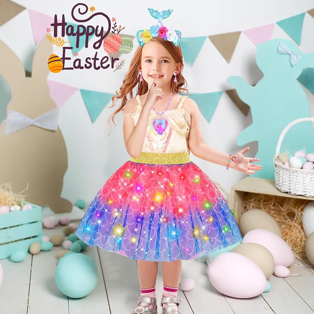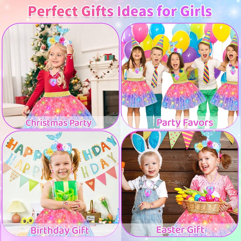 Comfortable LED Unicorn Tutu Dress Princess Costume-Made from soft and comfortable fabric, unicorn dress up set is not only adorable but also easy for all-day wear to play freely. A soft elastic stretch sizes from 7 to 15 inches toys for 3 4 5 6 7 8 year old girls long hours of imaginative adventures.A rainbow-colored skirt glows with embedded LED lights, creating a mesmerizing cascade of colors that embody the very essence of magic and wonder.Let your little girl shine in this fabulous dress