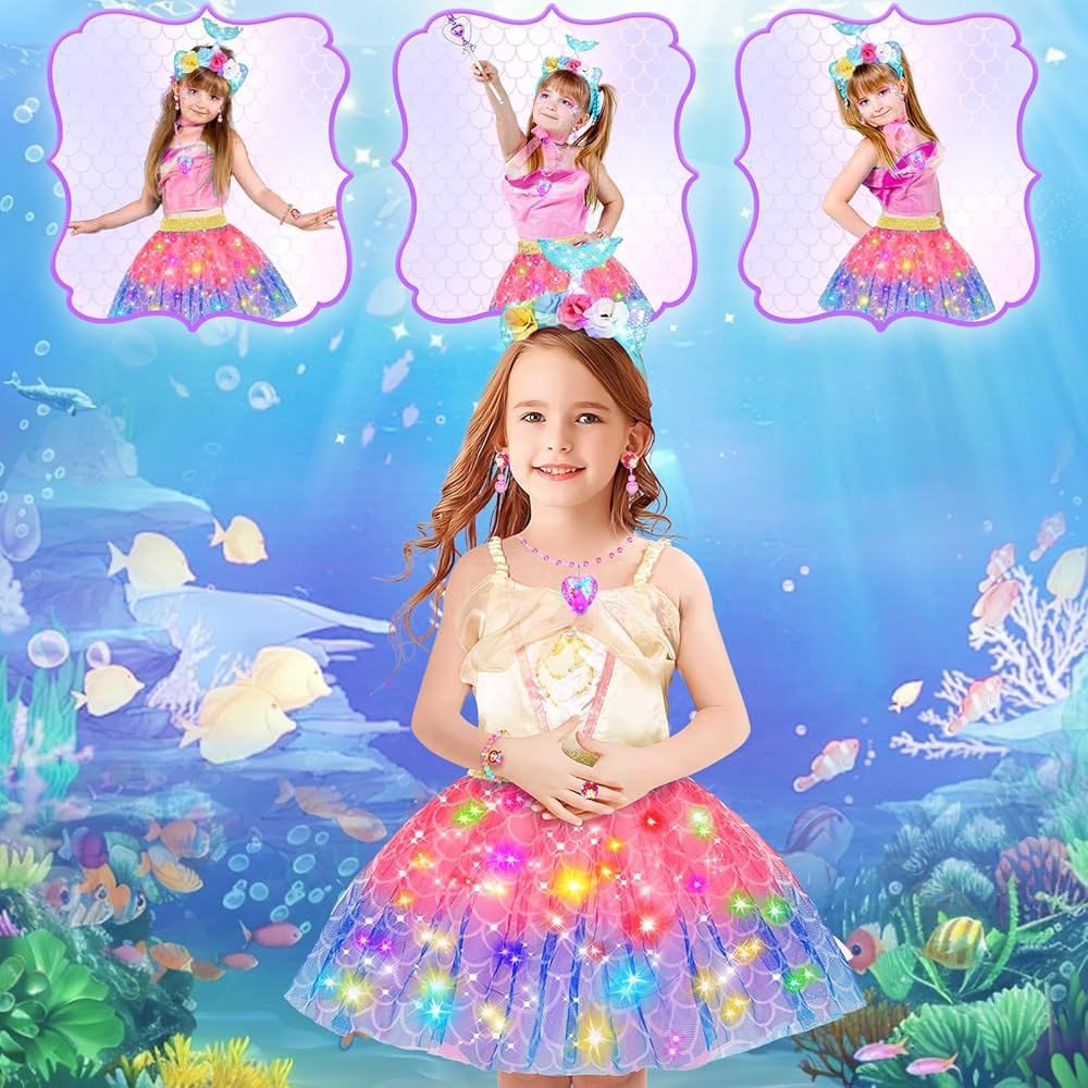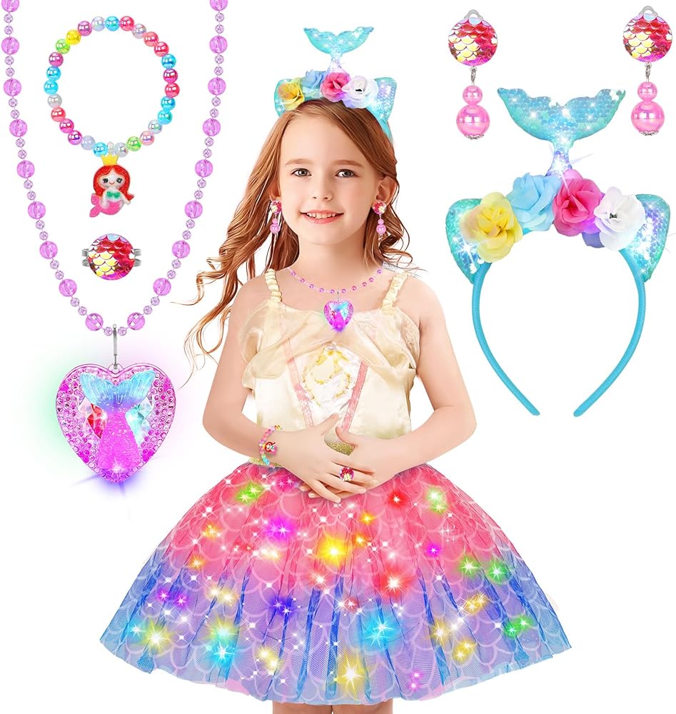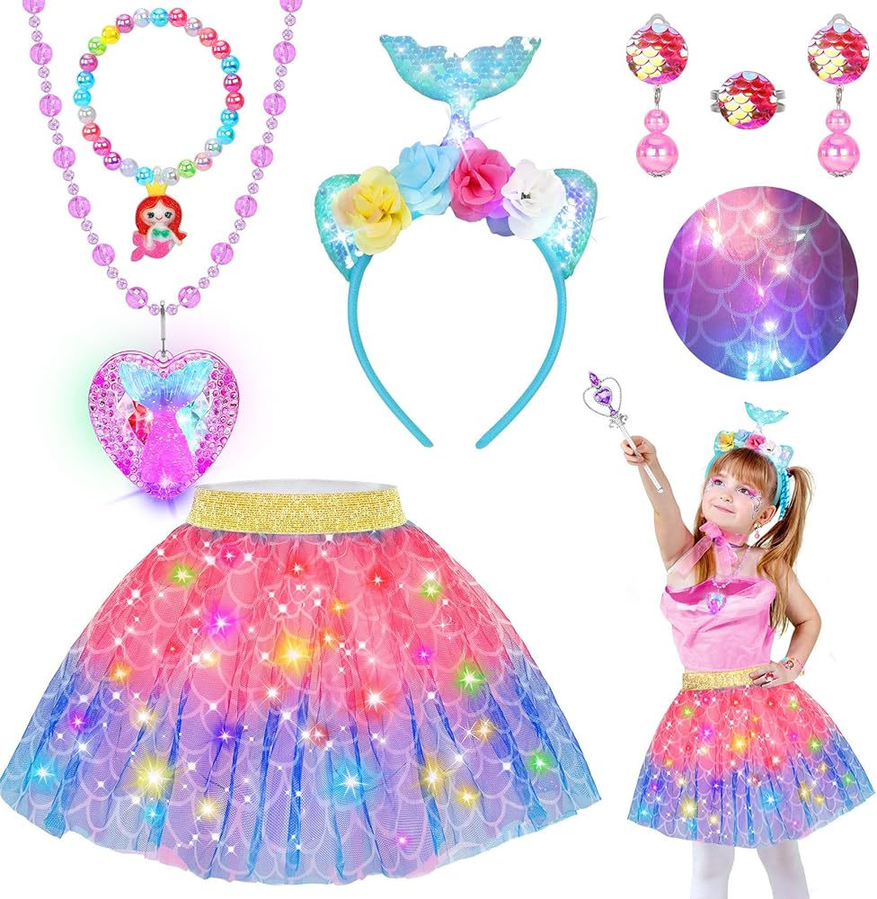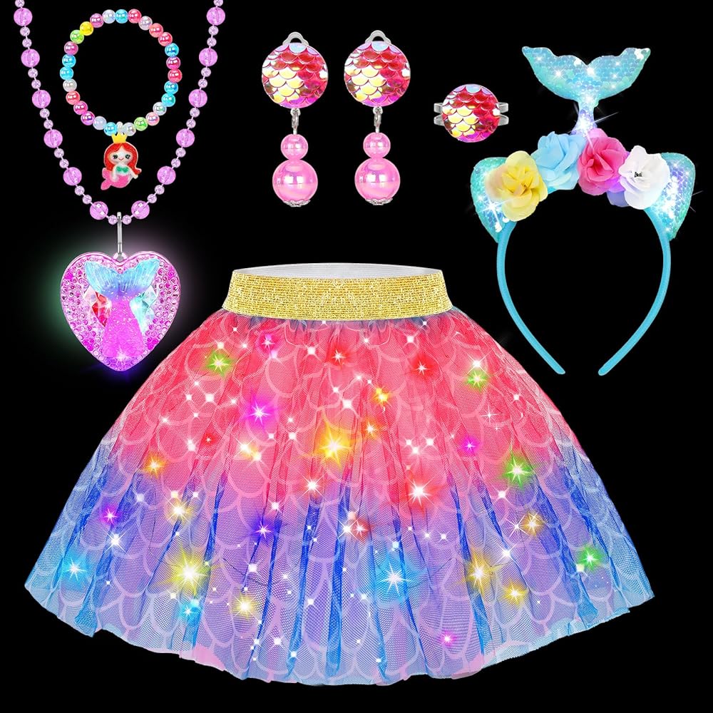 Comfortable LED Unicorn Tutu Dress Princess Costume-Made from soft and comfortable fabric, unicorn dress up set is not only adorable but also easy for all-day wear to play freely. A soft elastic stretch sizes from 7 to 15 inches toys for 3 4 5 6 7 8 year old girls long hours of imaginative adventures.A rainbow-colored skirt glows with embedded LED lights, creating a mesmerizing cascade of colors that embody the very essence of magic and wonder.Let your little girl shine in this fabulous dress