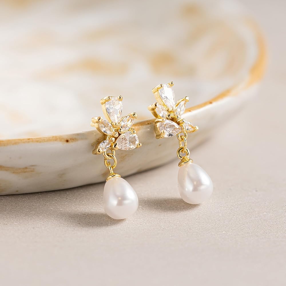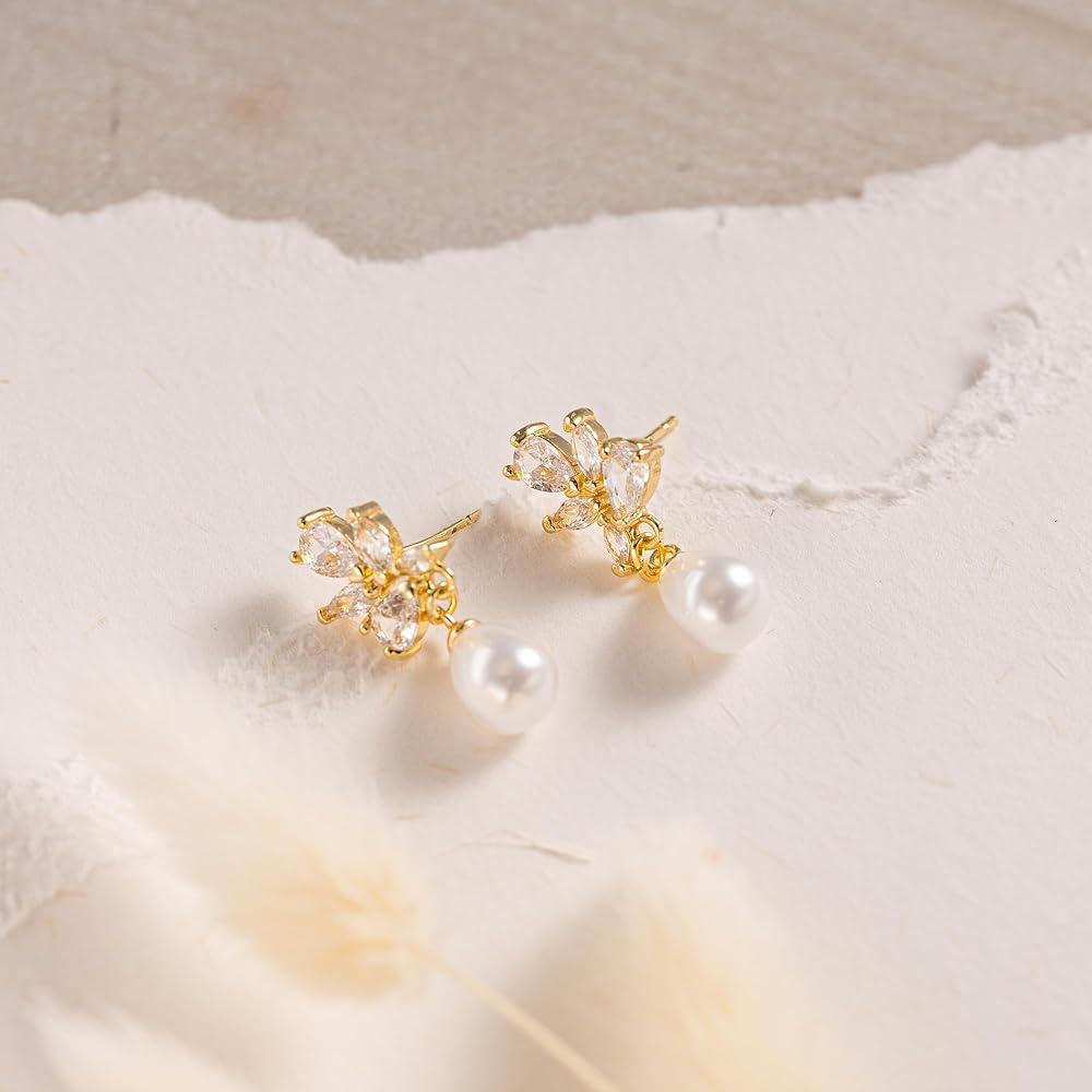 Hanli 14k Gold Plated Prom Prom Pearl Elegant arics for Brides - Gold CZ Dangle Drop Conte Bridal arring for Women Dainty Danling Stud arrings Jewelry Trendy
