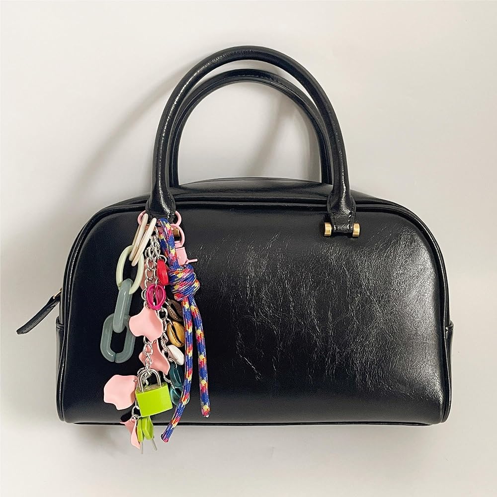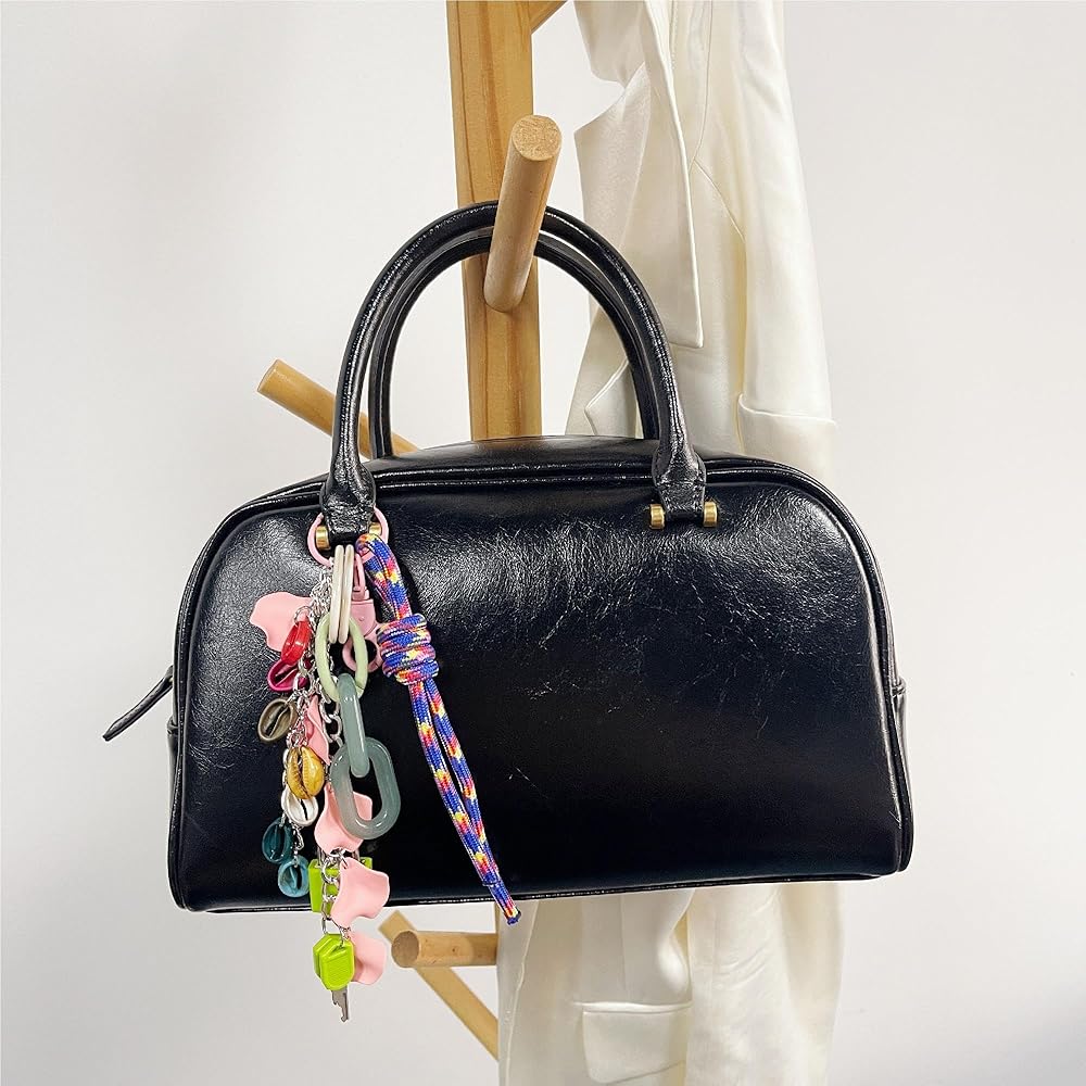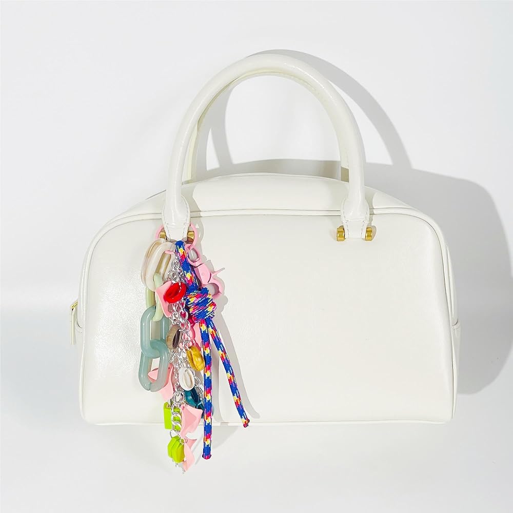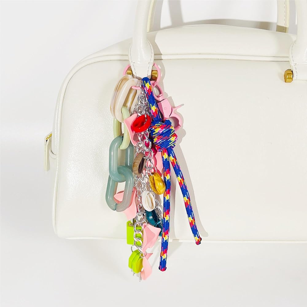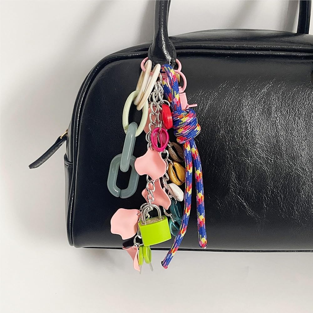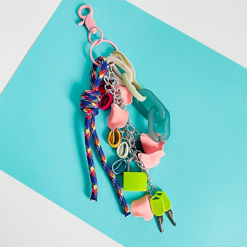 Unique and Colorful Design: This Bag charm features a combination of silver chains and various vibrant elements including pink flower petals, multicolored seashells, green lock and key charms, an acrylic chain, and a handmade nylon rope. The combination of colors and textures creates a unique and eye-catching design that will add sophistication and style to your bag.