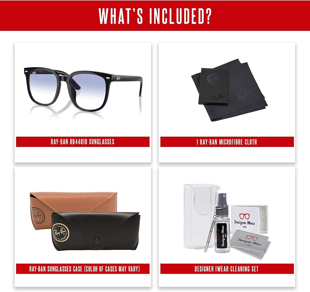 تضمنت الملحقات: تعزيز تجربة Ray-Ban الخاصة بك مع حزمة إكسسوارات كاملة بما في ذلك علبة حماية تحمل علامة Ray-Ban وقطعة قماش لتنظيف الألياف الدقيقة للحفاظ على نظاراتك الشمسية في حالة بدائية. بالإضافة إلى ذلك ، تشتمل حزمة الحصرية الخاصة بنا على مجموعة تنظيف العدسات المتميزة وسلسلة مفاتيح مفك البراغي والمرآة وحقيبة نظارة شمسية أنيقة لحماية وراحة إضافية.