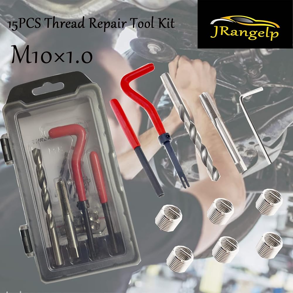 مجموعة أدوات إصلاح الخيوط 15 قطعة من JRangelp M10×1.0 مجموعة أدوات إصلاح الخيط/الصنبور أدوات إصلاح الخيوط التالفة المتوافقة مع مجموعة أدوات يدوية لإصلاح السيارة