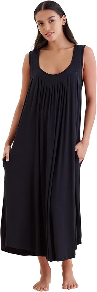 Experience sweet dreams in this relaxed fit nightgown, Sleeveless with scoop neckline and pleated detail. Convenient side seam pockets for your small items, 48'' long from shoulders; measured from size M. Incredibly soft stretch modal blend Brand: Papinelle, Style Number: 20300. Body: 92% Modal, 8% Elastane.