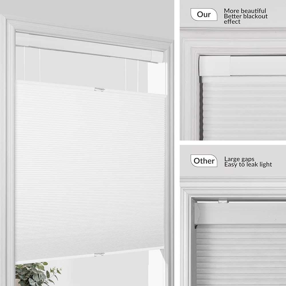 Berissa من أعلى إلى أسفل الظلال الخلوية إلى أسفل اللاسلكي لا أدوات الستائر للنوافذ الداخلية لا يوجد حفر عسل العسل ظلال سهلة التثبيت ، المكتب ، المنزل ، 34 "W × 64" H (100 ٪ تعتيم) أبيض