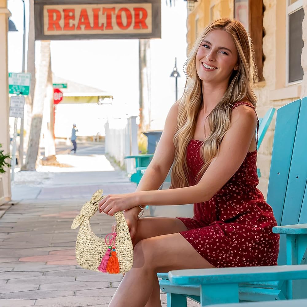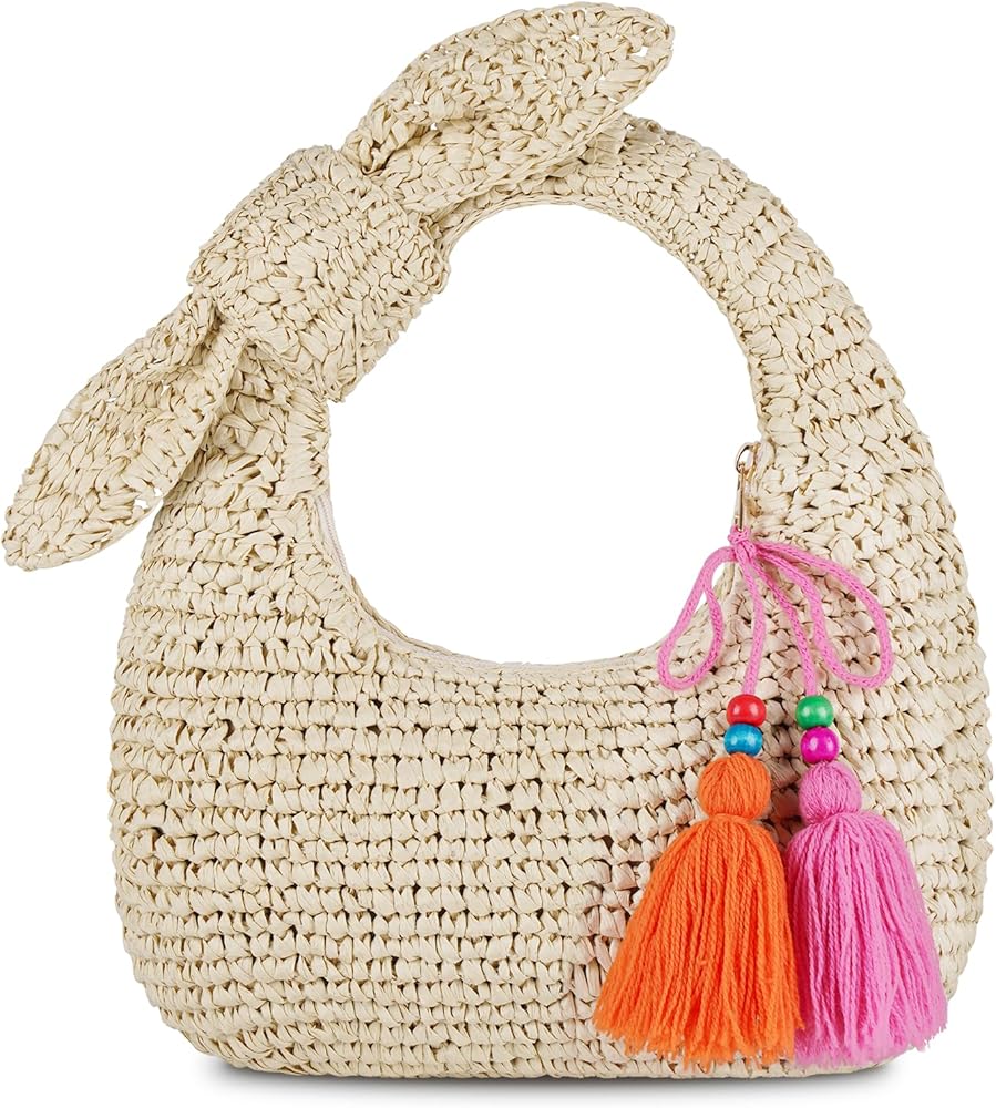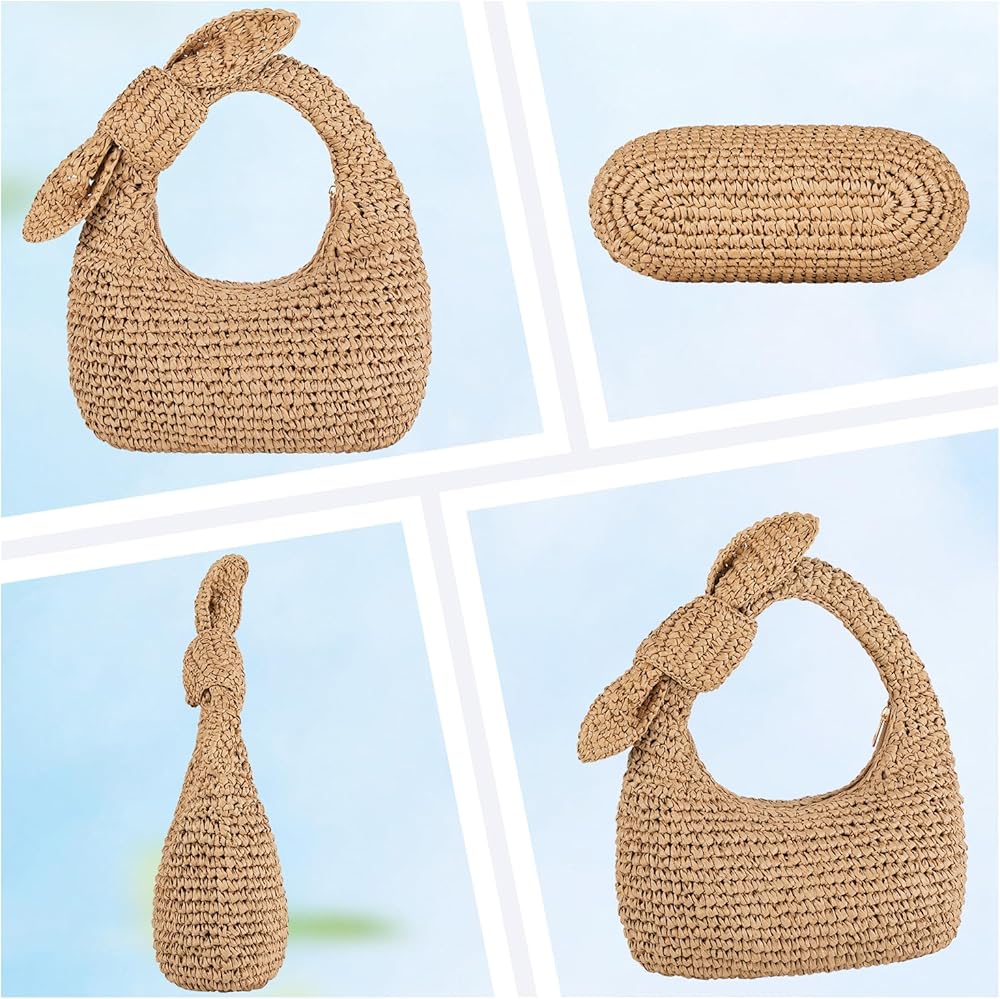 تصميم لطيف: قابض حقيبة يد القش هذه العصرية والوظيفية. شكل الهلال. تم تصميم حقيبة الشاطئ الصيفية مع شرابات قابلة للإزالة وديكور القوس. حقيبة المتشرد الصغيرة مصنوعة من مادة القش الطبيعية. نظرة لطيفة ومميزة لهذا الصيف.