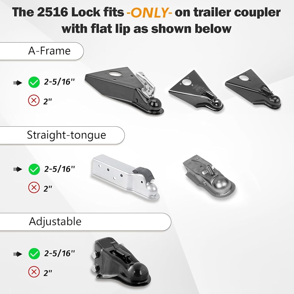 • تصميم المفاتيح الفريد: يحتوي قفل مقرن المقطورة على تصميم مفتاح خاص يمنع أي شخص من اختيار القفل. موقع قفل الأسطوانة يجعل من الصعب الوصول إلى اللصوص والوجه الدوار لمنع الحفر. *ملاحظة: يأتي كل قفل فقط مع مفتاحين فريدين. بمجرد الضياع ، لا يمكننا تقديم أي مفاتيح إضافية.