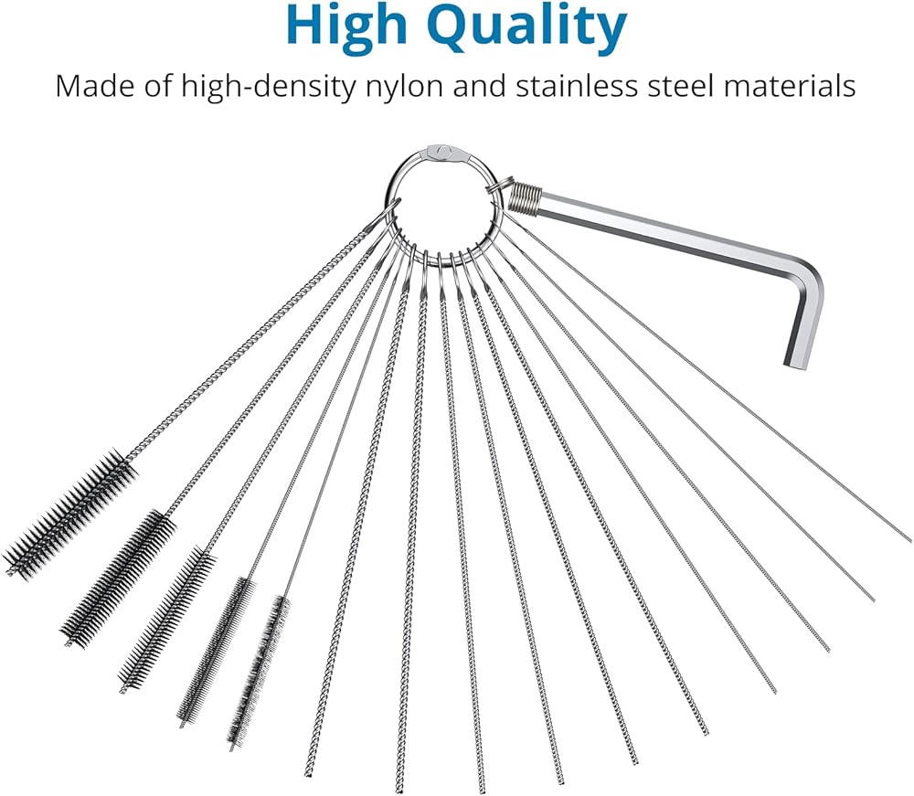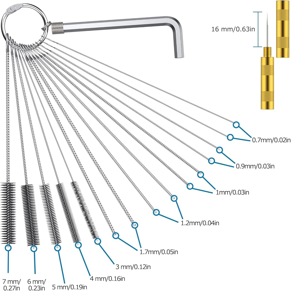 مجموعة أدوات تنظيف الكربوهيدرات 20 قطعة إبرة تنظيف، 10 قطع فرشاة تنظيف، 1 قطعة 13 سلك أداة تنظيف المكربن بالإضافة إلى 2 قطعة مفتاح سداسي. قطر الفرش: 2 مم، 3 مم، 4 مم، 5 مم، 7 مم /0.08 بوصة، 0.125 بوصة، 0.28 بوصة.