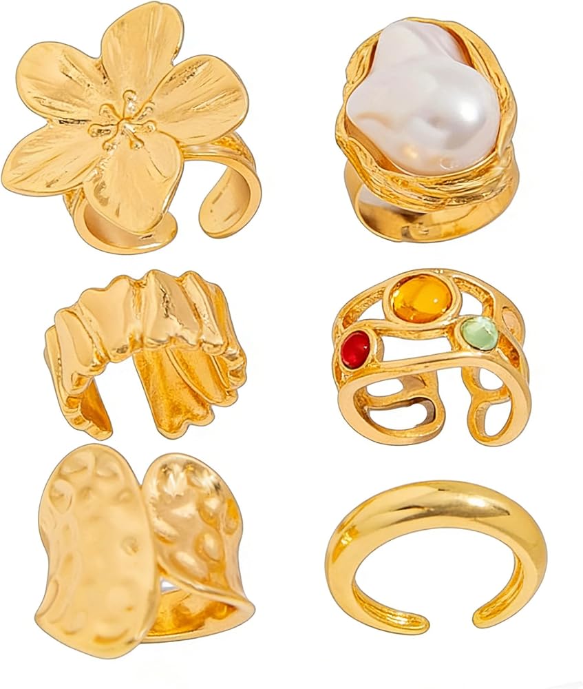 • Gold Flower Ring:our chunky knuckle rings for women feature a bold and trendy design you will get 6pices statement rings, those rings come in many different styles, include flower ring, baroque pearl ring,dome ring, open ring, you can wear separately or stack them together