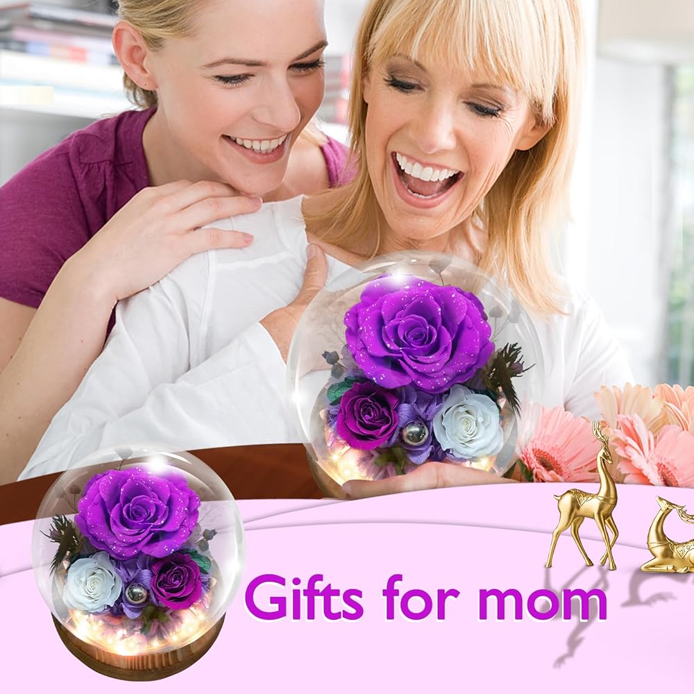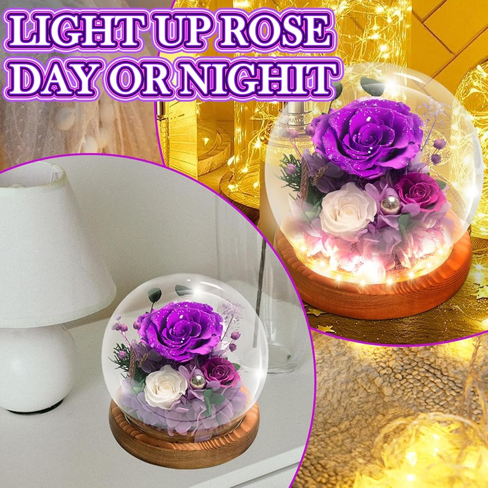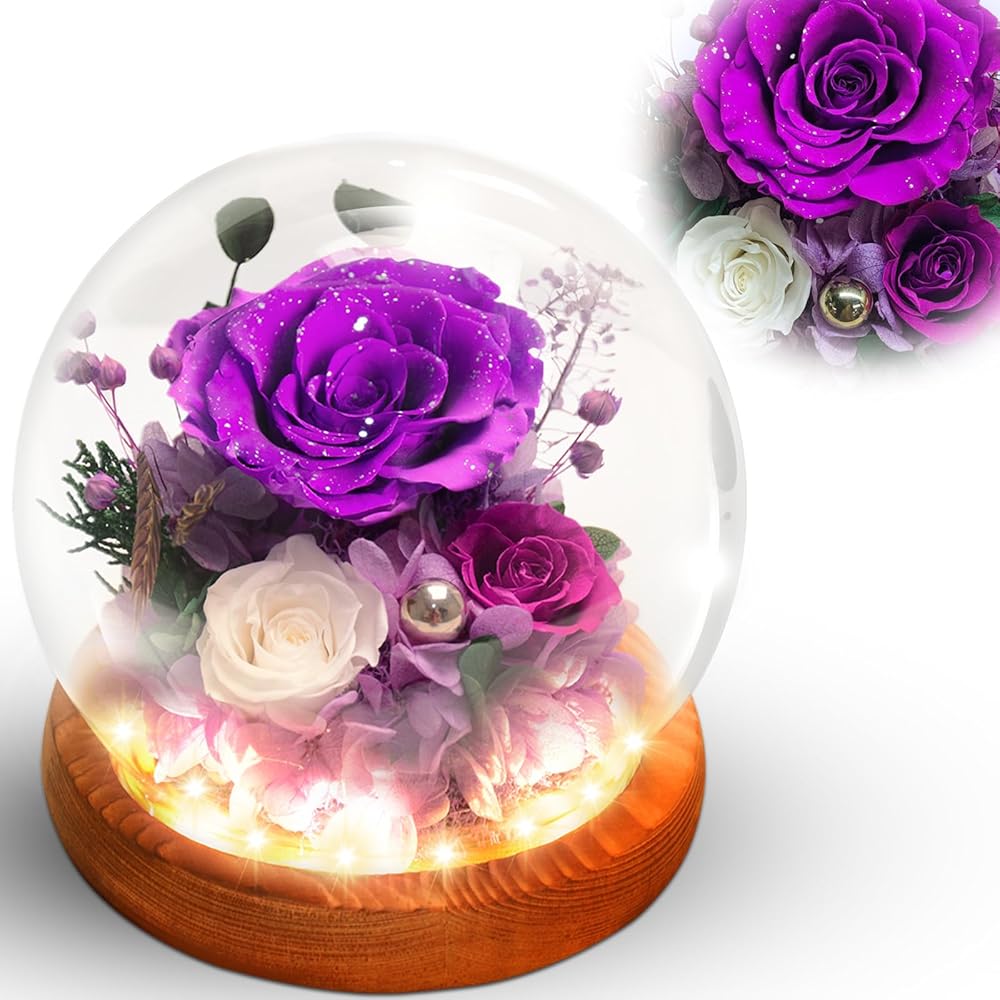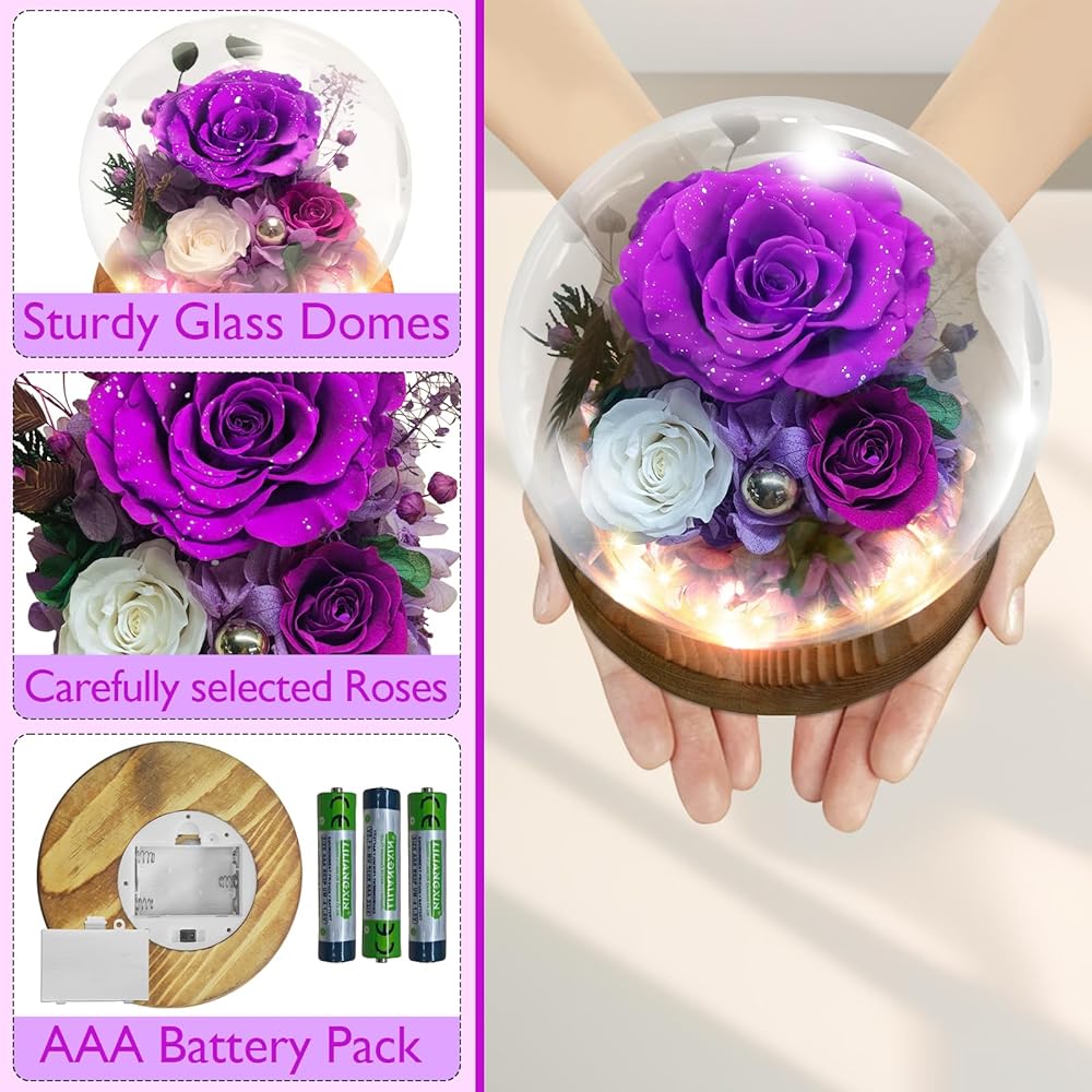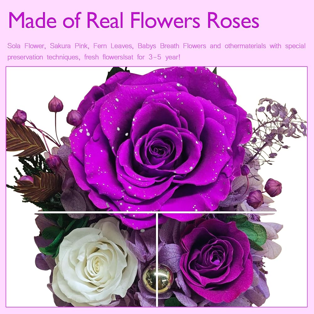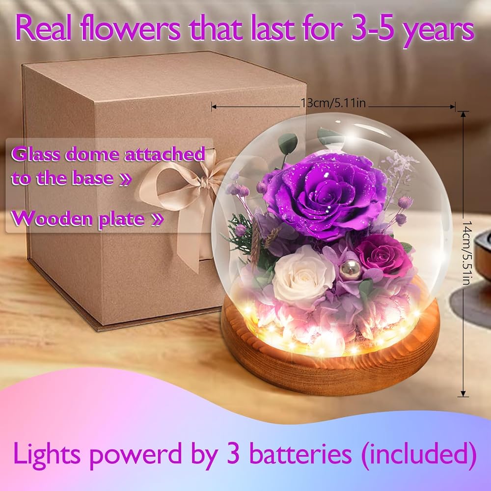 الجمال مع الزهور المحفوظة: تشمل 3 ورود محفوظة حقيقية ، محاطة بدقة العشب الذيل الأرنب ، الكوبية ، أوراق الأوكالبتوس ، وغيرها من النباتات الطبيعية. يقع التصميم على قاعدة خشب الخوخ المكررة التي تنبعث من العطر اللطيف والممتع ، ويتم رفع التصميم بواسطة مصابيح LED مدمجة وتناثر اللؤلؤ لمسة من الفخامة. مع بتلات معتمدة من غبار الفضة المتلألئة ، مدعوم من 3 بطاريات AAA (مدرجة) ، تنضح هذه الأزهار الأرجواني سحرًا فاخرًا وثمينًا.