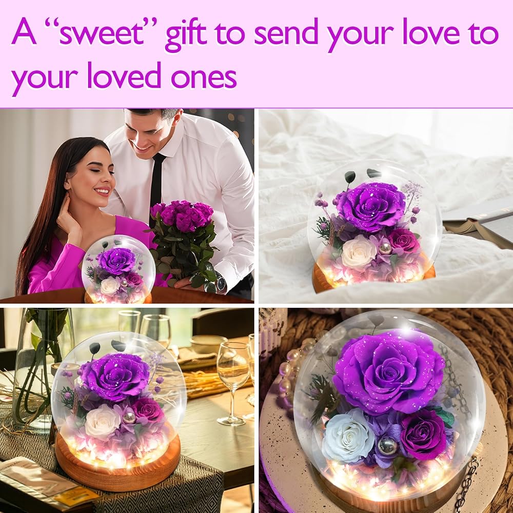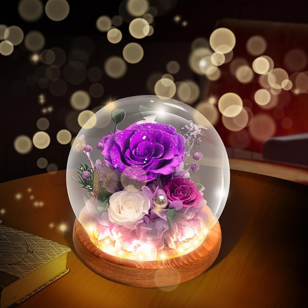 الساحر LED Glow: الزهور الحقيقية في القبة الزجاجية ، يتم إضاءة ترتيب الزهور الأرجواني بأضواء LED الناعمة ، مما يلقي توهجًا لطيفًا ودافئًا يعزز الجمال الطبيعي للزهور. تضيف الأنوار لمسة سحرية ، مثالية لإنشاء جو رومانسي مريح في أي غرفة.