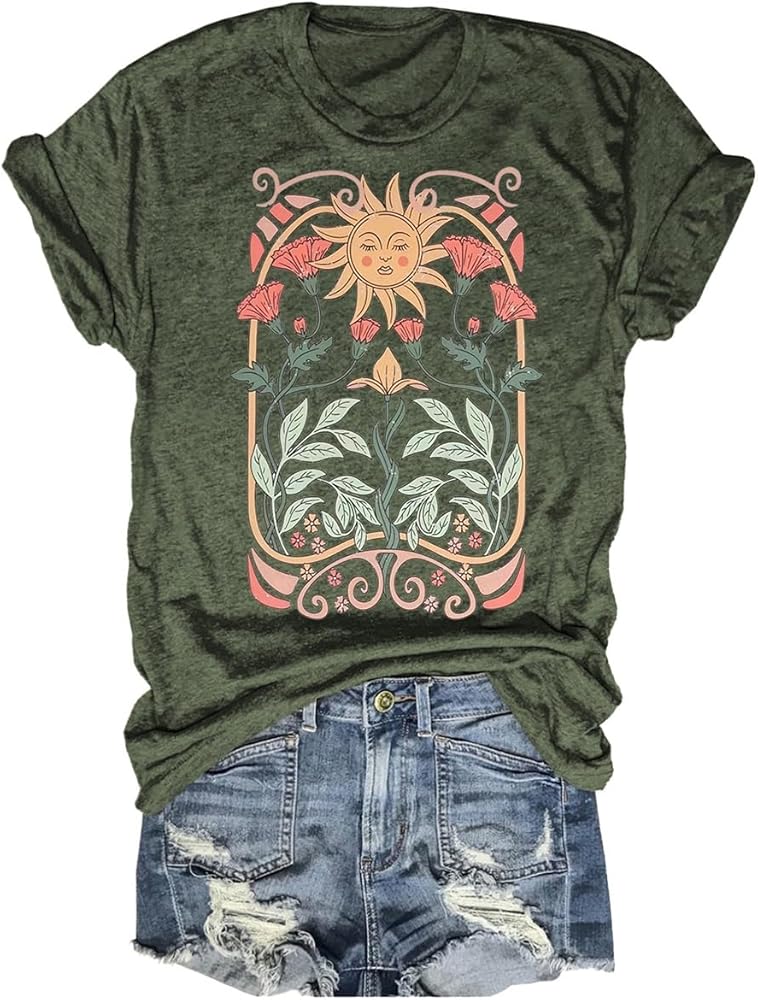 - نساء بوهو الأزهار تي شيرت الصيف غير الرسمي الفن نوفيو الزهور البرية عتيقة الزهور الطبيعة Tees Tees Tops