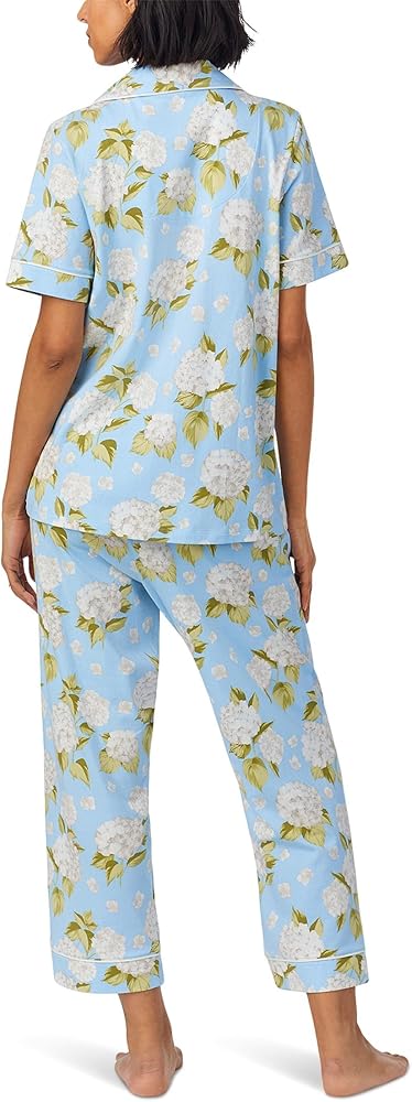 Indulge in ultimate comfort and style with the Bedhead PJs Women's Organic Cotton Short Sleeve Cropped Pajama Set. This exquisite two-piece set is designed for the modern woman who values both relaxation and elegance. Crafted from a blend of 93% organic cotton and 7% elastane, it offers a soft, breathable feel that's perfect for lounging at home or enjoying a cozy night's sleep. The pajama top features a chic notch lapel collar neckline, short sleeves, and a button front closure, all accented with contrast knit piping for a refined touch. A convenient chest pocket adds functionality without compromising style. The pajama pants are designed with a fully elasticated waistband, ensuring a snug yet comfortable fit, while self-hem bands with contrast piping add a subtle flair. Side hand pockets are a thoughtful addition, offering a place to keep essentials close. The allover printed design brings a playful yet sophisticated element to your nightwear collection. Machine washable for easy care, this pajama set is ideal for women who appreciate quality and style. Whether you're curling up with a good book, hosting a pajama party, or simply unwinding after a long day, this pajama set is your go-to choice. Its versatile appeal makes it suitable for all seasons, effortlessly blending into your wardrobe. Experience the blend of aesthetics and practicality designed to cater to those who desire both comfort and fashion.