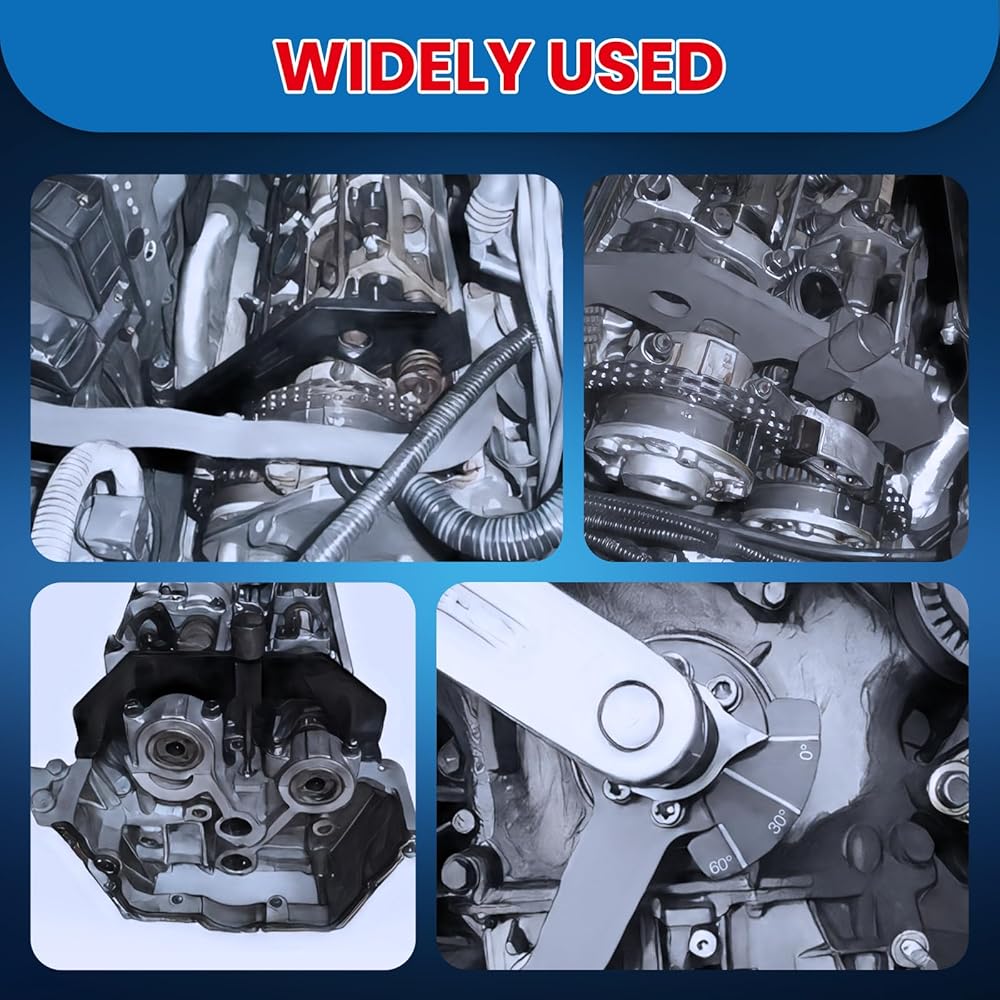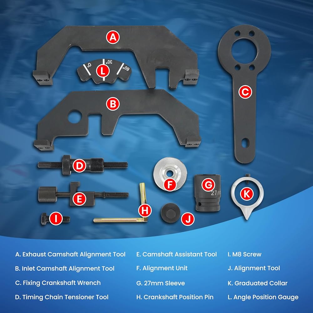 Package Includes: 1 Inlet Camshaft Alignment Tool, 1 Exhaust Camshaft Alignment Tool, 1 Flywheel Locking Pin, 1 Timing Chain Tensioner Tool, 1 Crankshaft Position Tool, 1 Valvetronic Sockets, 1 Angle Indicator, 1 Angle Position Gauge, 1 27mm Sleeve, 1 Holder with Screw